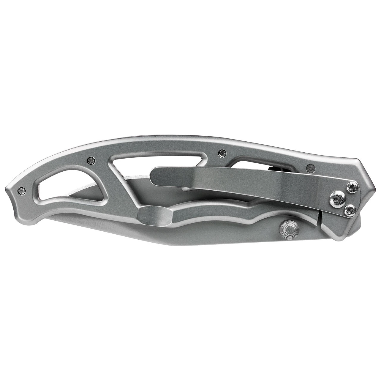 Klinge und Griff des Klappmessers Gerber Paraframe I, das Sie bereits bei der ersten Benutzung durch sein geringes Gewicht begeistern wird, sind aus rostfreiem Stahl gefertigt, sodass an seiner Robustheit und Kompaktheit kein Zweifel bestehen kann. Das einhändige Öffnen wird durch den doppelseitigen Pin an der Klinge deutlich erleichtert. Für ein sicheres Arbeiten mit diesem Messer sorgt die Frame-Lock-Sicherheitsverriegelung.