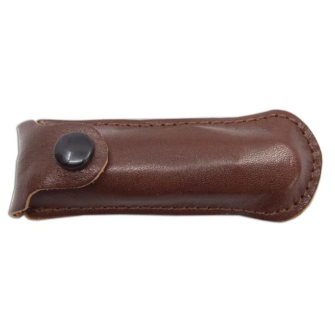 Im Lieferumfang ist ein braunes Lederetui mit Patentverschluss (ohne Gürtelschlaufe) enthalten, das das Messer beim Tragen schützt. Dank seiner kompakten Abmessungen passt er in jede Tasche und jeden Rucksack und ist somit immer griffbereit.