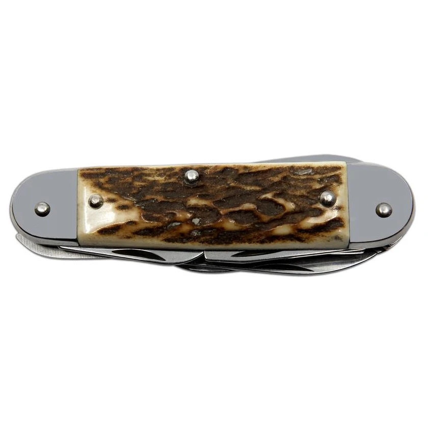 Die Klinge und die anderen Werkzeuge sind aus hochwertigem Edelstahl vom Typ 420 mit einer Härte von 52–55 HRc gefertigt, der sich durch Verschleißfestigkeit und Korrosionsbeständigkeit auszeichnet. Der Griff aus echtem Hirschhorn verleiht dem Messer ein elegantes Aussehen und sorgt für einen komfortablen und sicheren Halt.
