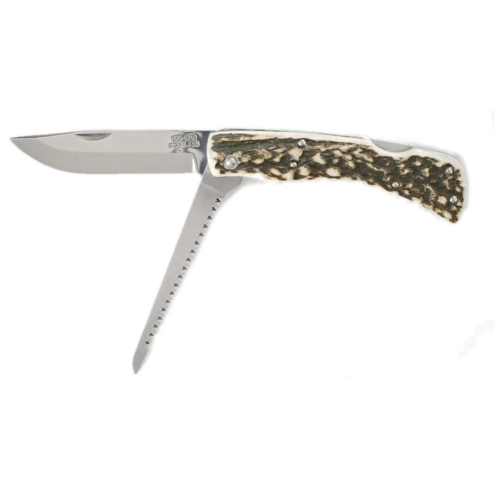 Für die Herstellung des Messers werden nur die besten Materialien verwendet. Der Griff besteht sogar aus echtem Hirschgeweih, während die Klingen aus speziellem Edelstahl 440A mit einer Härte von 56 HRc bestehen. Die Hauptklinge ist mit einer zuverlässigen BackLock-Sicherheitsverriegelung gesichert, die ein versehentliches Öffnen verhindert. Zusätzlich zu dieser Klinge mit einer Länge von 9,1 cm ist das Messer auch mit einer sehr praktischen verlängerten Sägeausgestattet, die sich von der Vorderseite des Messers aus öffnen lässt - ohne Sicherung. Im Lieferumfang ist auch eine elegante Ledertasche mit dem Logo dieses kultigen tschechischen Unternehmens enthalten.