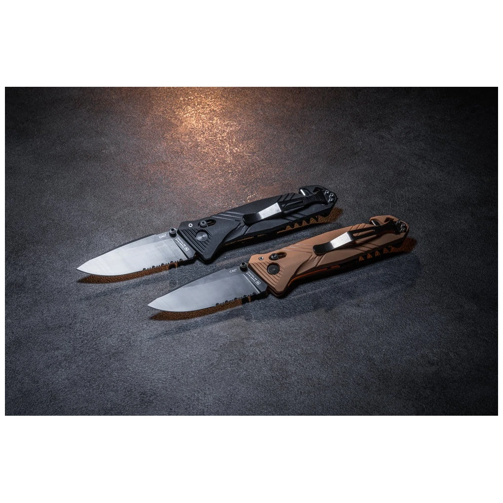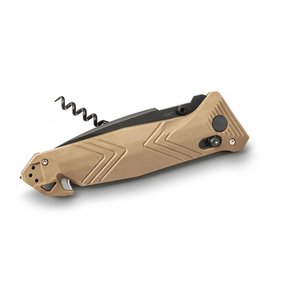 Sichern Sie den AXIS®-Verriegelungsmechanismus mithilfe einer beweglichen Achse. Dieser Mechanismus ist äußerst robust und gewährleistet eine einwandfreie Verriegelung der Klinge in der geöffneten Position. Das CAC®-Messer wurde 2017 aufgrund seiner Leistung, Robustheit, Qualität und seines Preises offiziell von der französischen Armee ausgewählt. Das CAC®-Messer verfügt außerdem über einen Fensterbrecher, einen Korkenzieher und einen doppelseitigen Gürtelclip.