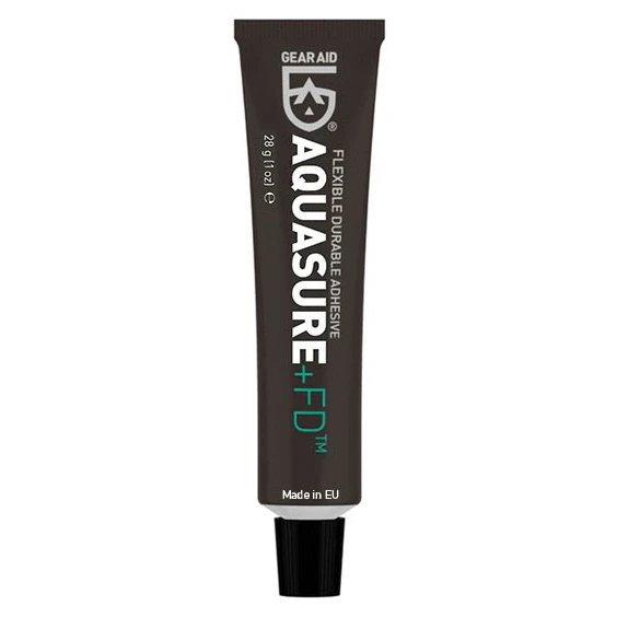 Kleber Aquasure +FD™ 28 g ist ein Klebstoff auf Polyurethanbasis zum Reparieren von Neopren und beschichteten Stoffen mittlerer Stärke (Cordura usw.). Von den organischen Klebstoffen auf Lösungsmittelbasis der Firma Gear Aid hat er eine mittlere Viskosität, bildet eine Schichtdicke von etwa 1 mm und die polymerisierte PU-Gummischicht ist selbsttragend, elastisch und flexibel. Das Rollo ist absolut wasserdicht. Es ermöglicht eine flickenfreie Verklebung und Heilung sowie die Rekonstruktion fehlenden Materials. Beim Verkleben von Schlauchbooten und Matratzen ist eine Flickenauflage notwendig.