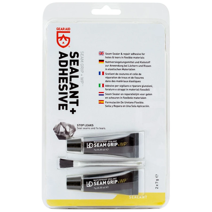 Gear Aid Seam Grip +WP™ ist ein Klebstoff auf Polyurethanbasis zur wasserdichten Nahtimprägnierung und Reparatur beschädigter beschichteter Textilien mit geringerem Gewicht (Zelte, GTX-Bekleidung usw.). Er weist von den auf organischen Lösungsmitteln basierenden Klebstoffen der Firma Gear Aid die niedrigste Viskosität auf und bildet somit eine dünne, aber dennoch selbsttragende Schicht mit hoher Elastizität und Flexibilität. Die niedrige Viskosität ermöglicht ein leichtes Eindringen in mikroskopische Nahtlecks. Das Rollo ist absolut wasserdicht. Es ermöglicht eine flickenfreie Verklebung und Heilung sowie die Rekonstruktion fehlenden Materials.