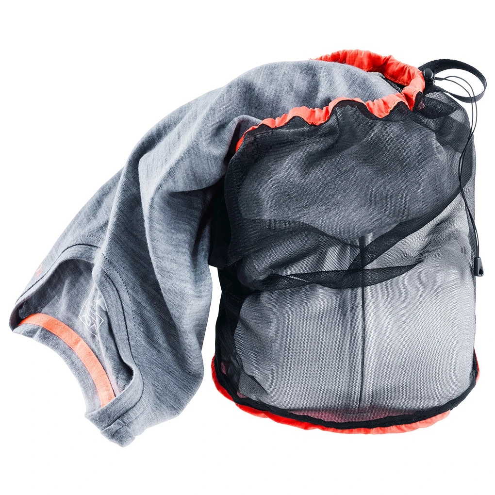 Netztasche Deuter Mesh Sack 5 mit wasserdichtem Boden zum einfacheren Verstauen von Dingen, nicht nur im Rucksack. Der Beutel wird mit einem Kordelzug zusammengezogen.