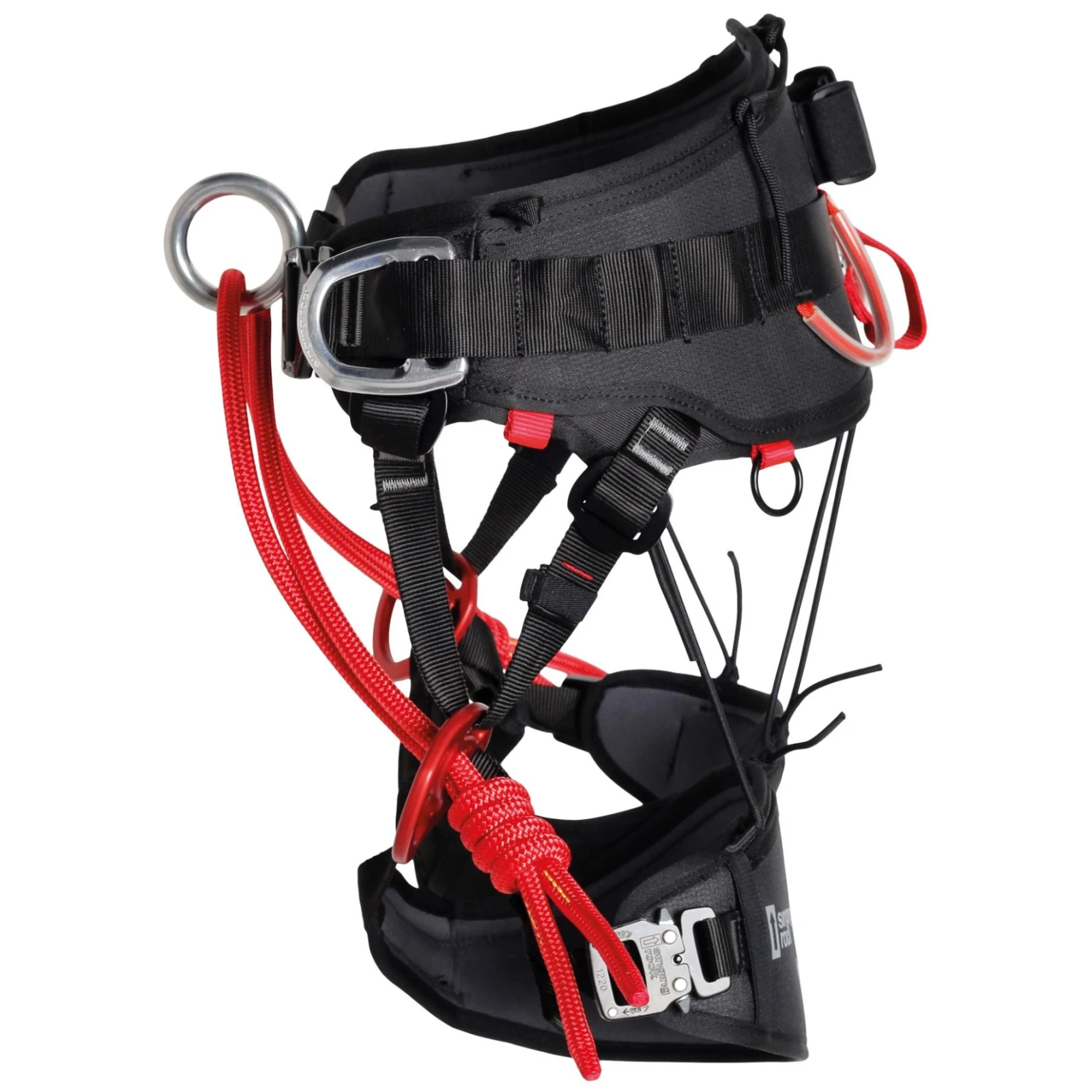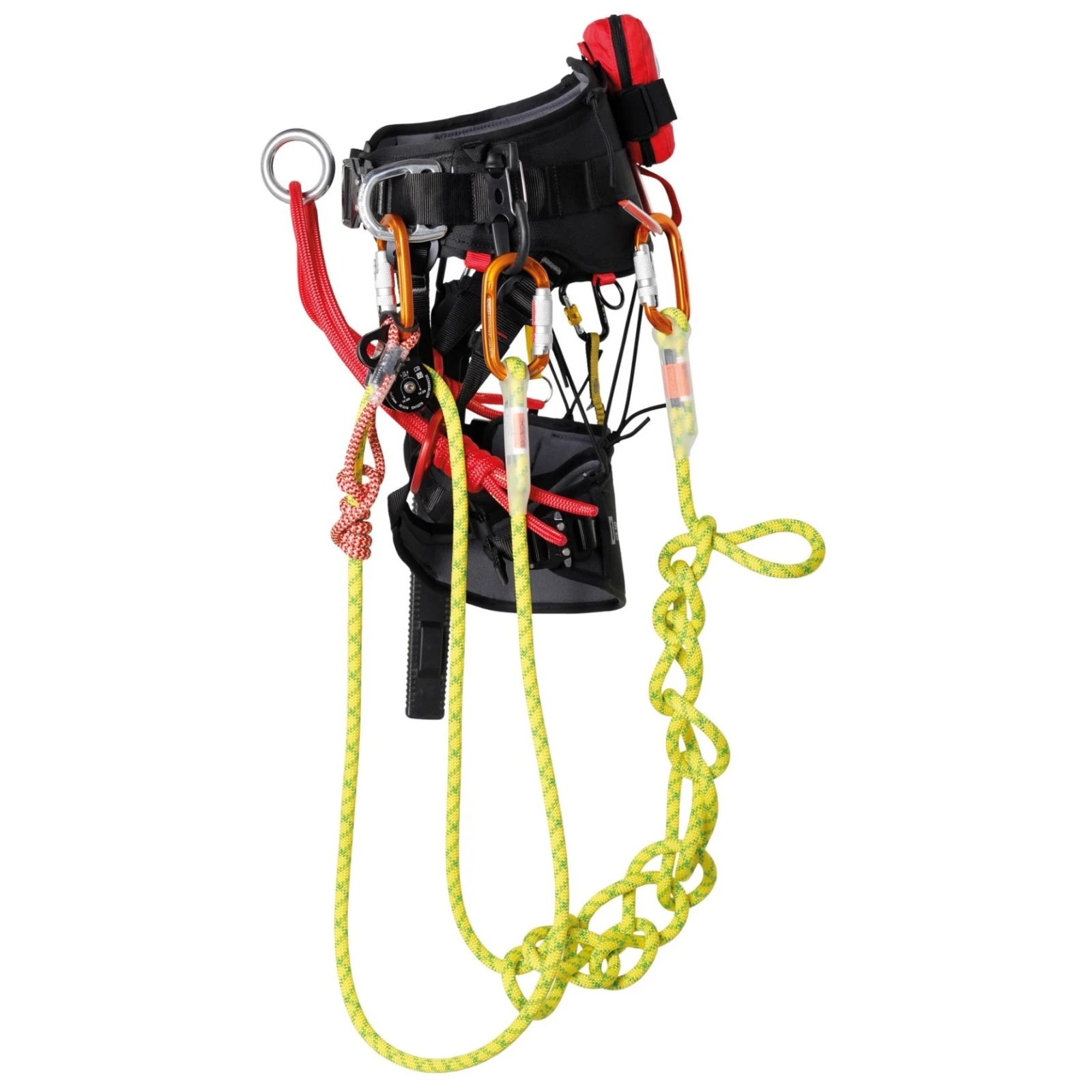 - rote, seitlich verstellbare D-Ringe zwischen Beinen und Hüfte zur Anbringung eines Sicherungspunktes, Verwendung nur paarweise nach EN 813 mit einer Belastbarkeit von 15 kN