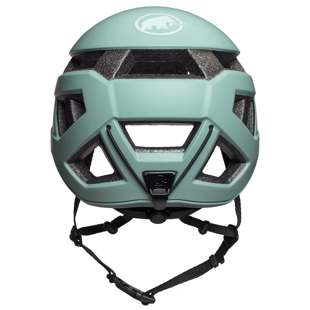 Kletterhelm Mammut Crag Sender bietet erhöhten Schutz gegen seitliche Stöße, der über die vorgeschriebene Norm hinausgeht. DieSchale des Helms ist tiefer und schützt den Kopf an den Seiten besser als herkömmliche Kletterhelme. Der Kern wird im Spritzgussverfahren aus EPS-Schaumhergestellt. Der Helm ist daher sehr leicht. Geschickt platzierte Lüftungslöcher garantieren eine gute Belüftung. Was einen guten Helm ausmacht, ist vor allem seine Form. Der Crag Sender sitzt perfekt auf dem Kopf. Auch wenn der Kletterer den Kopf stark in den Nacken legt, verrutscht der Helm nicht. Der Umfang lässt sich einfach über ein Drehrad am Hinterkopf verstellen .