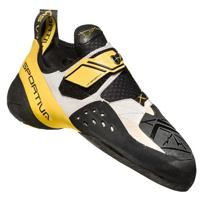 Der technische Kletterschuh La Sportiva Solution bietet Lösungen für Sportkletterer und Boulderer auf höchstem Niveau . Besonders an Überhängen und anspruchsvollen Boulderfelsen, wo Technik und Präzision im Vordergrund stehen, wirst du es zu schätzen wissen. Die Lösung bietet außergewöhnliche Präzision dank mehrerer patentierter Systeme: LockHarness hält den Schuh dank zweier sich kreuzender Riemen am Fuß, das P3-System sorgt für permanente Zehenflexion und die 3D-tarierte Ferse sitzt perfekt und ermöglicht präzises Putten. Die Spitze ist stark gummiert, um beim Ziehen an den Spitzen im Überhang guten Halt zu bieten. Die 3,5 mm dicke Vibram XS-Grip2-Sohle bietet maximalen Grip auf jedem Untergrund und beeinträchtigt nicht das natürliche Kontaktgefühl mit der Struktur.