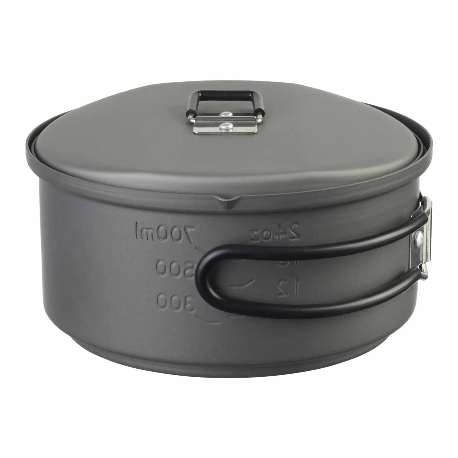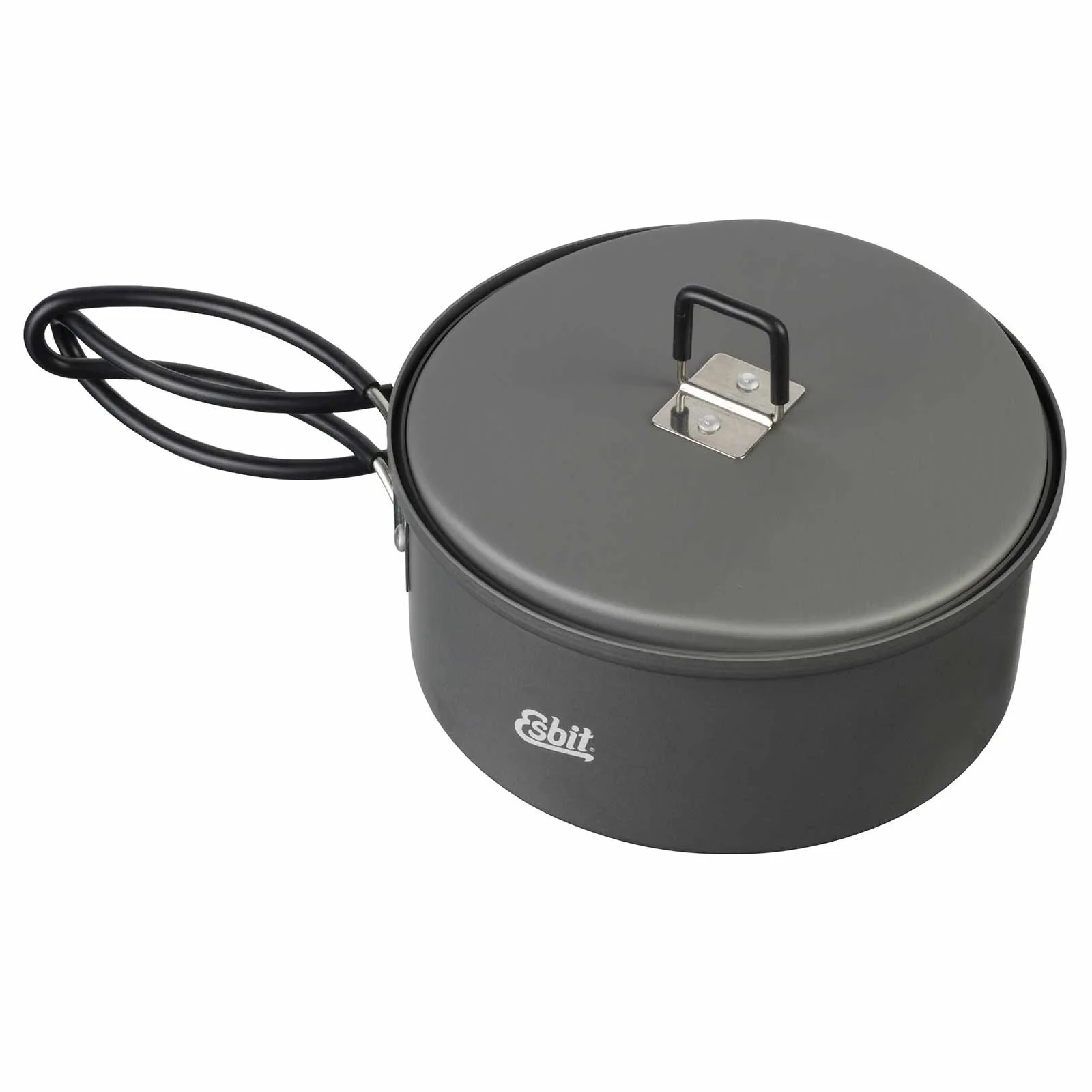 Rundes Camping- Kochset von Esbit in der Größe 1000 ml aus leichtem, hart eloxiertem Aluminium. Der Ständer ist so konzipiert, dass er perfekt auf den Topf passt und so eine stabile Kochfläche gewährleistet.