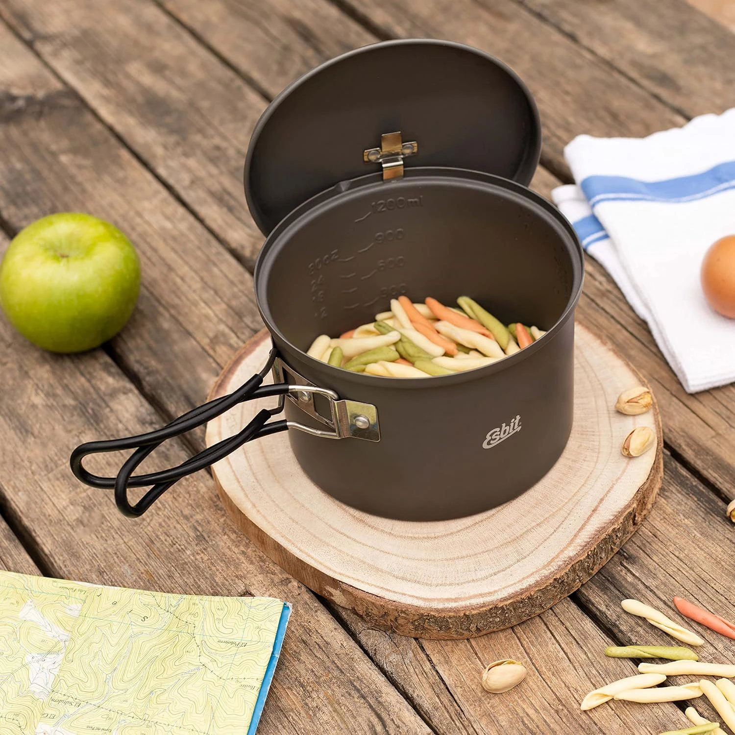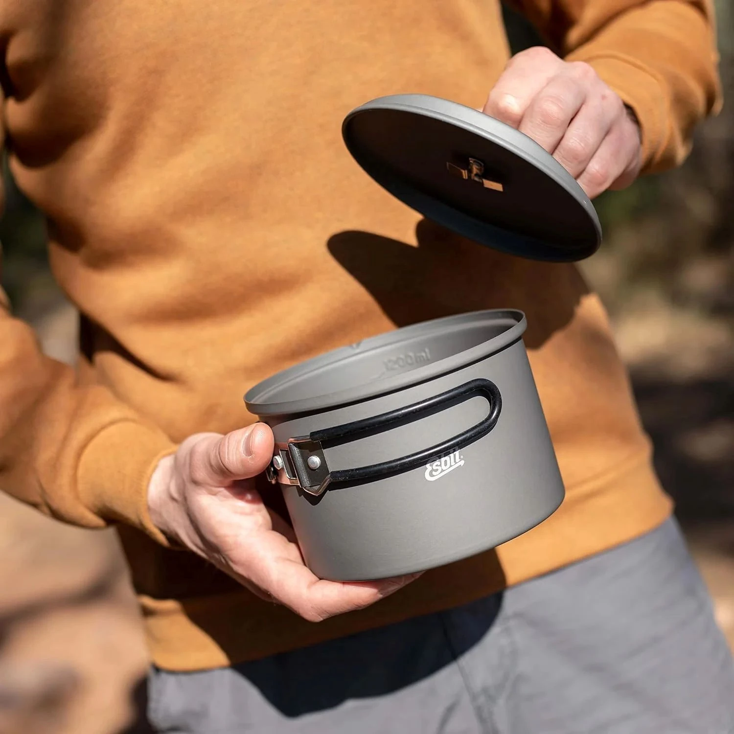 Der 1,6-Liter-Aluminiumtopf von Esbit ist zum Wärmeschutz mit Silikon beschichtet. Dank eines speziellen Details am Deckel ist das Kochen noch komfortabler. An der Unterseite befindet sich nämlich ein Bügel. Dieser ermöglicht es Ihnen, ihn an den Rand des Campingkochers zu hängen. So wird verhindert, dass der Deckel schmutzig wird. Gleichzeitig haben Sie beim Kochen die Hände frei.