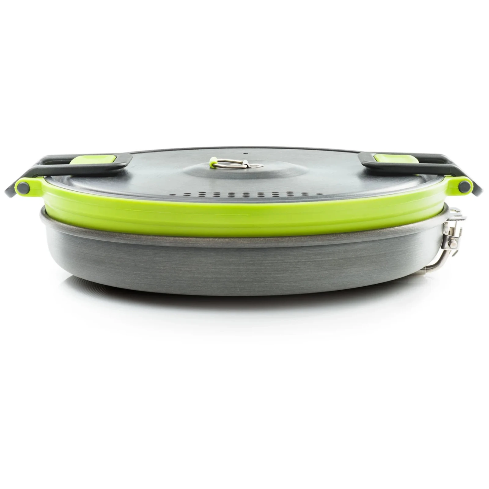 Der Topf hat einen praktischen leichten Deckel mit Öffnungen zum Abgießen und Silikonpolstern, mit denen Sie den Deckel sicher festhalten können. Der Topf hat eine Messlinie für eine einfache Dosierung. Dank der Griffe mit Doppelverriegelung lässt sich der Topf leicht verschließen und handhaben. Ein großer Vorteil ist die maximale Packbarkeit, die Topfstruktur lässt sich zu einer Scheibe mit einer maximalen Höhe von 49 mm zusammenfalten.