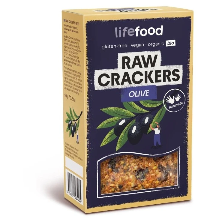 Ungebacken, voller Nährstoffe und Energie – LIFE CRACKERS Olive RAW BIO Crackers 90 g. Knusprig, knackig mit Mandeln, Buchweizen und rohen Oliven.