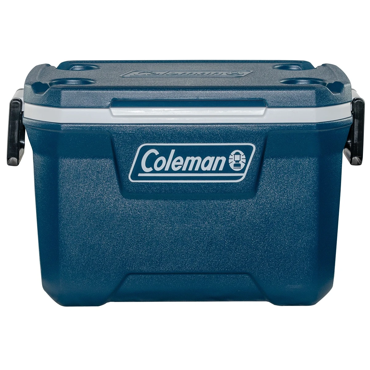Passive Kühlbox Coleman 52QT Kühltruhe mit 49 Liter Volumen. Dank Vollschaumisolierung hält er gefrorenes Eis bis zu vier Tage lang. Besonders praktisch sind die im Deckel integrierten Dosenhalter.