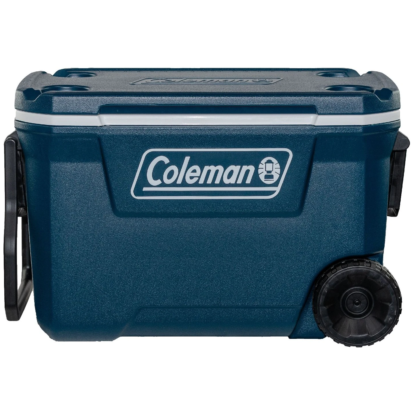 Passive Kühlbox Coleman 62QT Kühlbox auf Rädern mit einem Volumen von 58 Litern. Dank Vollschaumisolierung hält er gefrorenes Eis bis zu vier Tage lang. Der ausziehbare Teleskopgriff ermöglicht einen einfachen Transport. Besonders praktisch sind die im Deckel integrierten Dosenhalter.