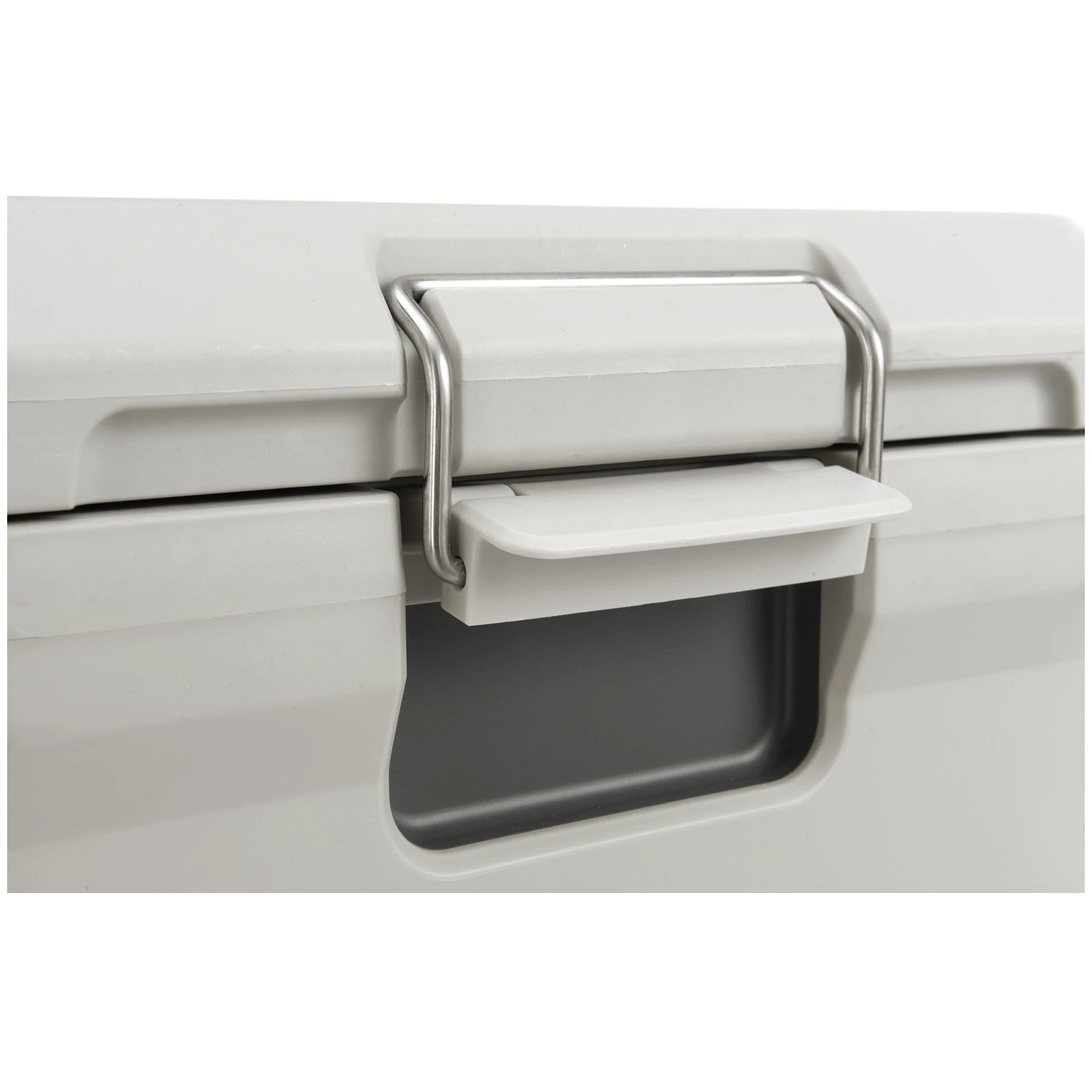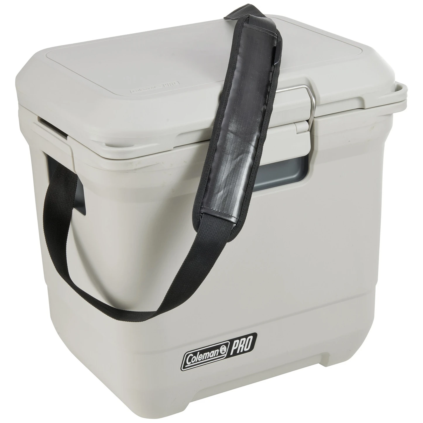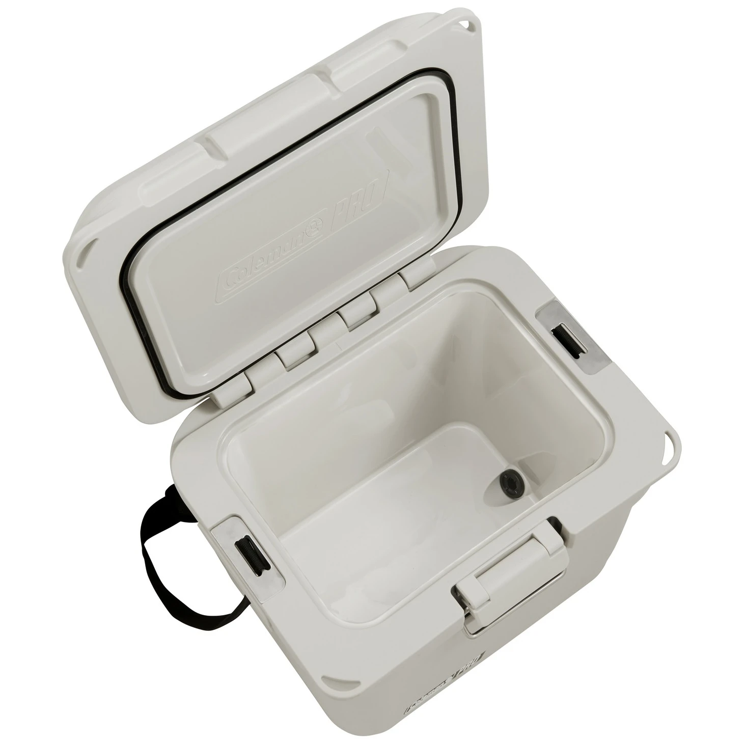 Professioneller und langlebiger Kühler Coleman Pro 25QT mit robuster Konstruktion, vollständig isoliertem Deckel und Korpus sowie hochwertiger Edelstahlhardware. Dank der soliden Frontschnalle ist eine perfekte Abdichtung gewährleistet und der Wärmeverlust wird minimiert. Ein praktischer Textilgurt sorgt für bequemes Tragen. Zum einfachen Ablassen von geschmolzenem Eis ist die Box mit einem Ablassventil ausgestattet. Er hält Eis bis zu 3 Tage und kann dank einer Deckelbelastbarkeit von bis zu 130 kg auch als praktische Sitzgelegenheit dienen.