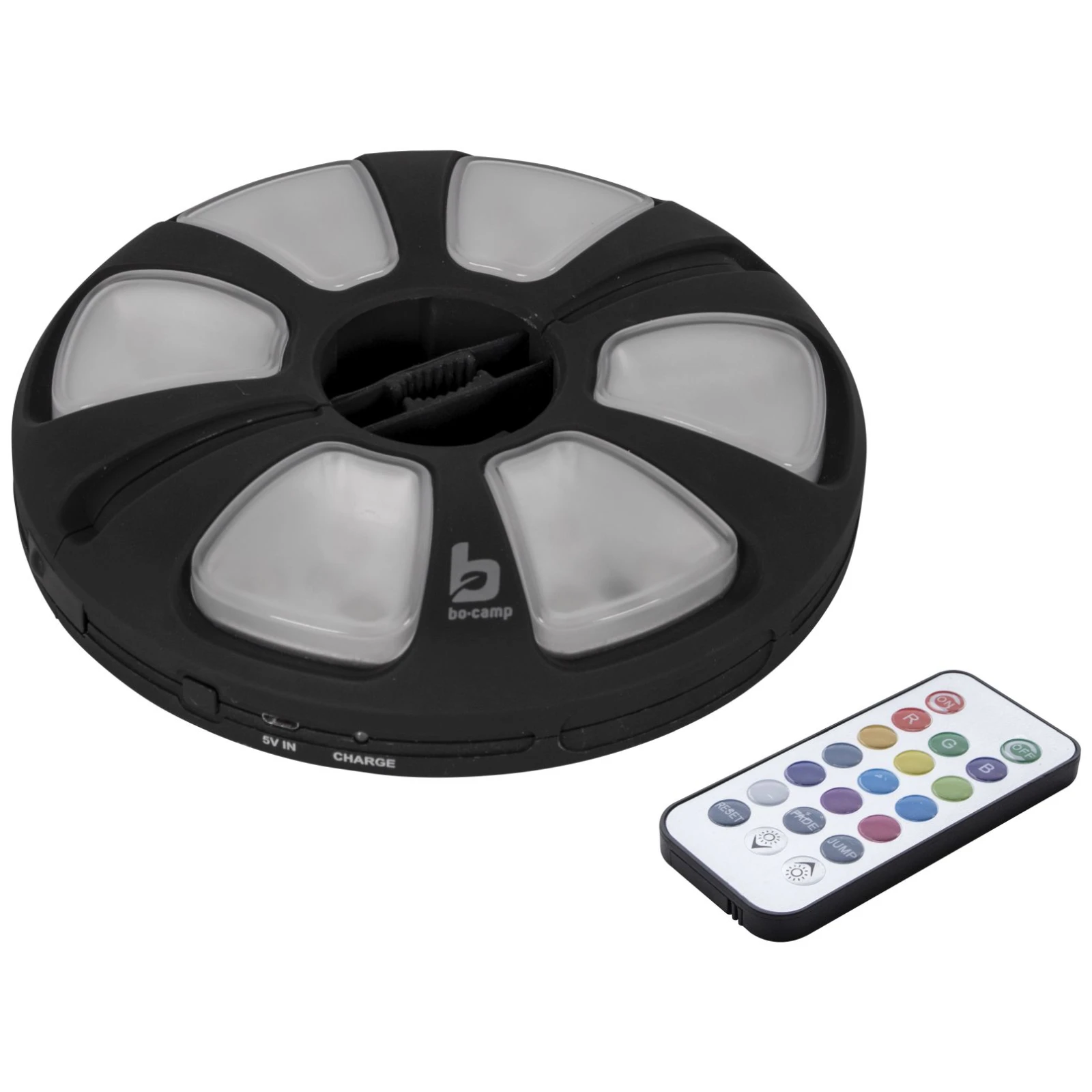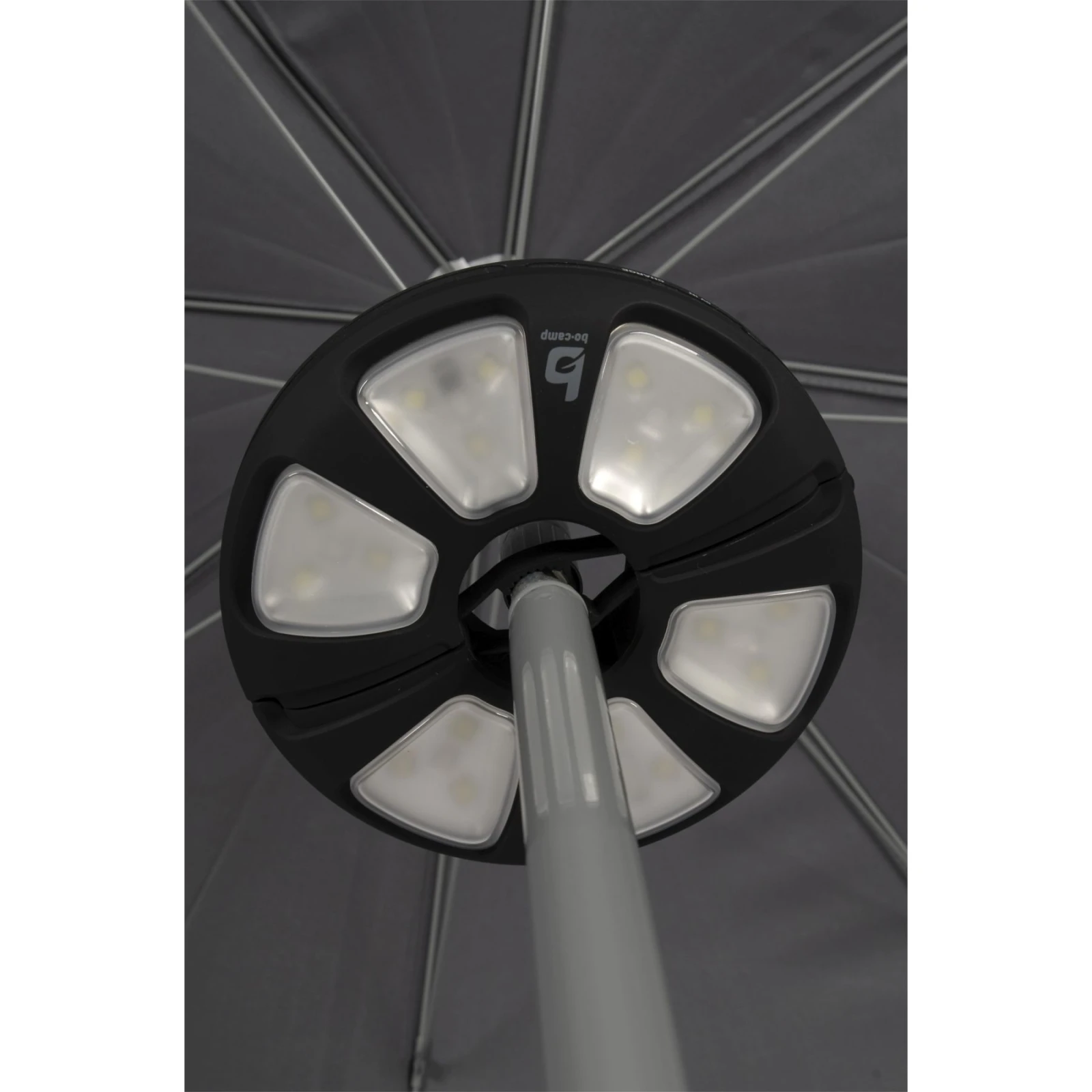 Eine praktische Lampe Bo-Camp Gemma Parasol Lampe, die Sie am Griff eines Sonnenschirmsoder an einer Zeltstange befestigen können. Es sorgt für angenehmes Licht dank warmweißer Farbe und verschiedenfarbiger LED-Beleuchtung. Dimmbar mit 14 verschiedenen Lichtmodi. Der eingebaute Lithium-Ionen-Akku kann über das mitgelieferte USB-Kabel aufgeladen werden. Inklusive Fernbedienung.