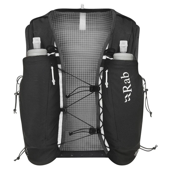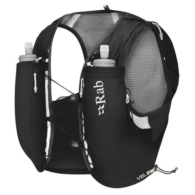 Die Laufweste Veil 12 der Marke Rab hat eine leichte Konstruktion mit atmungsaktivem Mesh und zahlreichen Taschen zum Verstauen der gesamten zum Laufen notwendigen Ausrüstung. Die Weste ist mit einer Trinkblase (nicht im Lieferumfang enthalten) kompatibel und enthält 2 leichte 500-ml-Flaschen.