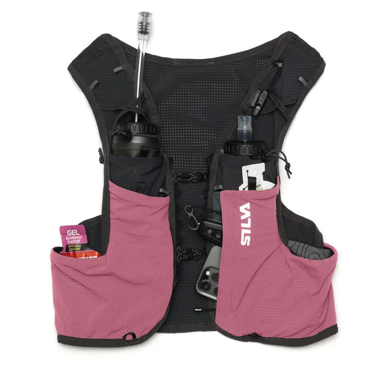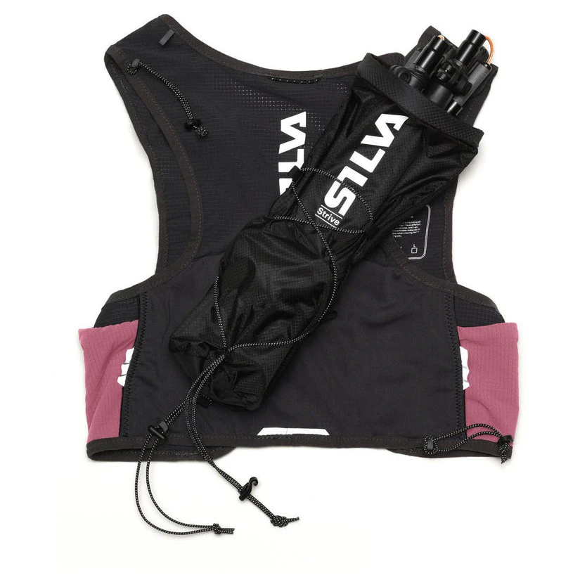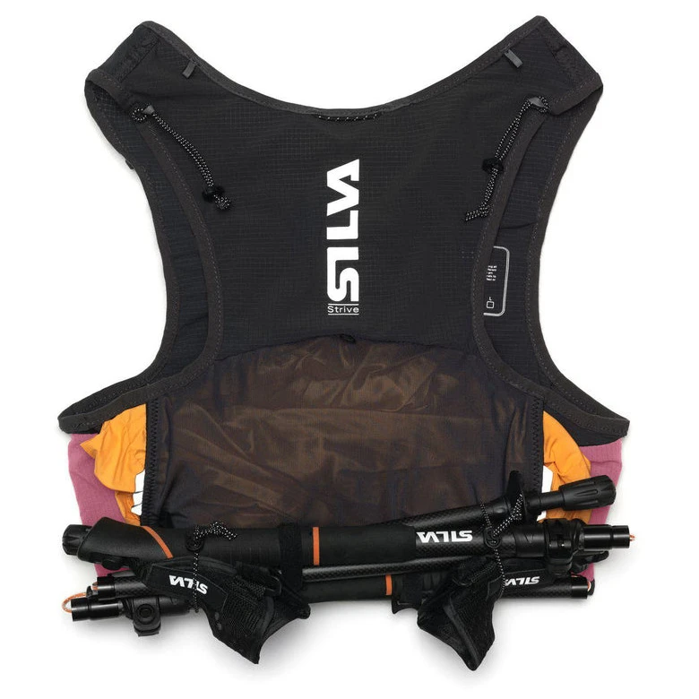 Auf der Rückseite befinden sich zwei Taschen – eine untere Längstasche und eine Hauptrücktasche, die über zwei Ausgänge für ein Stirnlampenkabel oder einen Trinkblasenschlauchverfügt. Zur sicheren Aufbewahrung der Batterie ist im Inneren eine kleine Tasche vorhanden. Die Stöcke können mit flexiblen, verstellbaren Gurten befestigt oder in der Köchertasche Silva verstaut werden, die bei Wettkämpfen eine einfachere Entnahme der Stöcke aus der Weste ermöglicht (Tasche nicht im Lieferumfang enthalten).