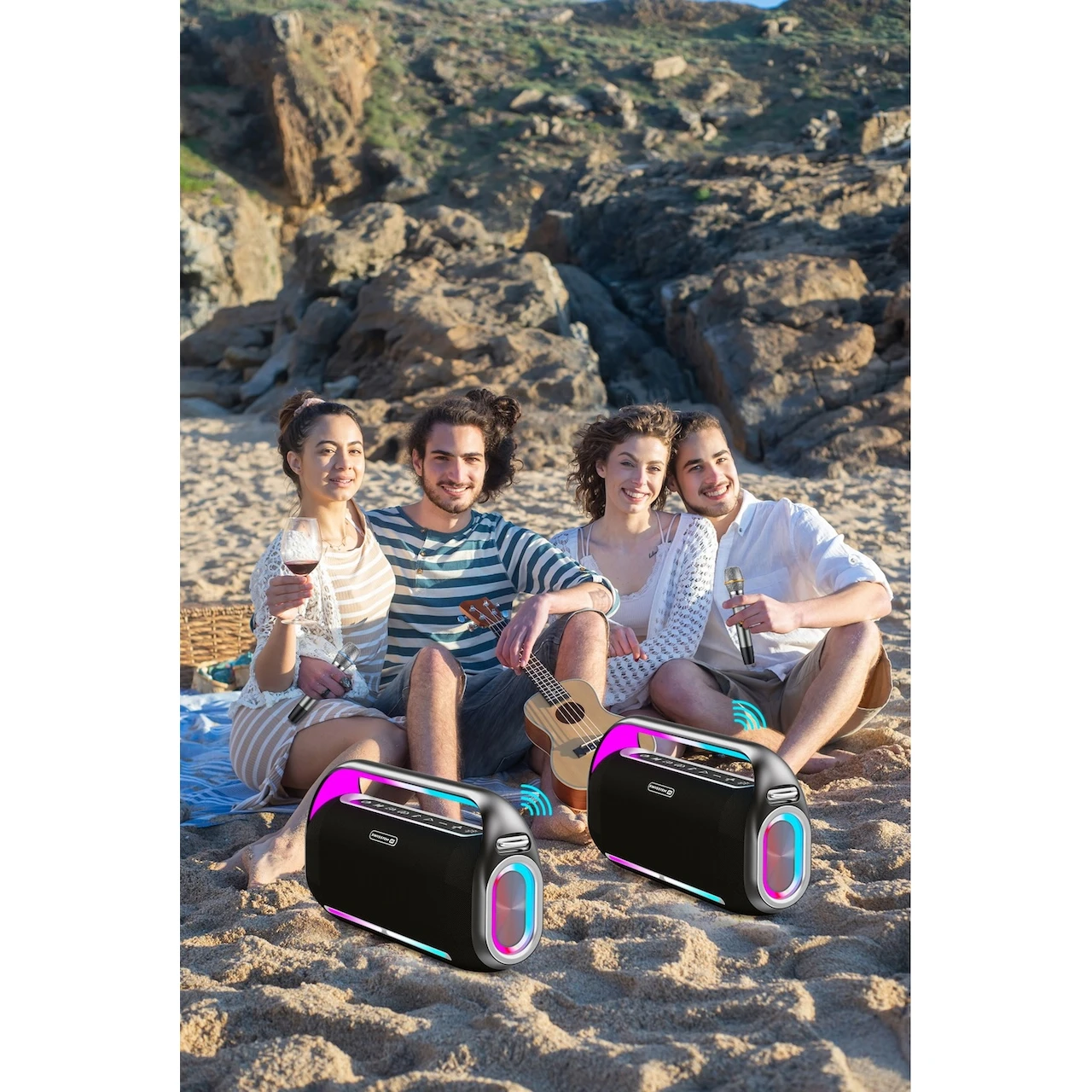 Im Paket ist ein Mikrofonenthalten, das mit dem Lautsprecher gekoppelt werden kann, sodass Sie bequem Karaoke veranstalten oder organisieren können. Das Gerät kann auch als Powerbankfungieren, mit der Sie jedes Gerät aufladen können, das mit einem Kabel mit USB-A-Anschluss verbunden werden kann.