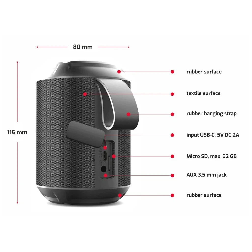 Der Lautsprecher hat eine Leistung von 24W. Dank der Bluetooth-Funktion können Sie es drahtlos mit Ihrem Mobiltelefon oder Computer verbinden und alle Ihre Inhalte abspielen. Der Anschluss ist aber auch über ein AUX-IN 3,5mm JACK Kabel oder über USB-C möglich und auch die Nutzung einer Micro-SD-Speicherkarte ist möglich.
