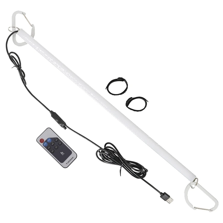 Die Lampe ist mit einem Ein-/Ausschalter, zwei Karabinern und einem Anschlusskabel ausgestattet. Die Länge des Lichtstreifens beträgt 50 cm.