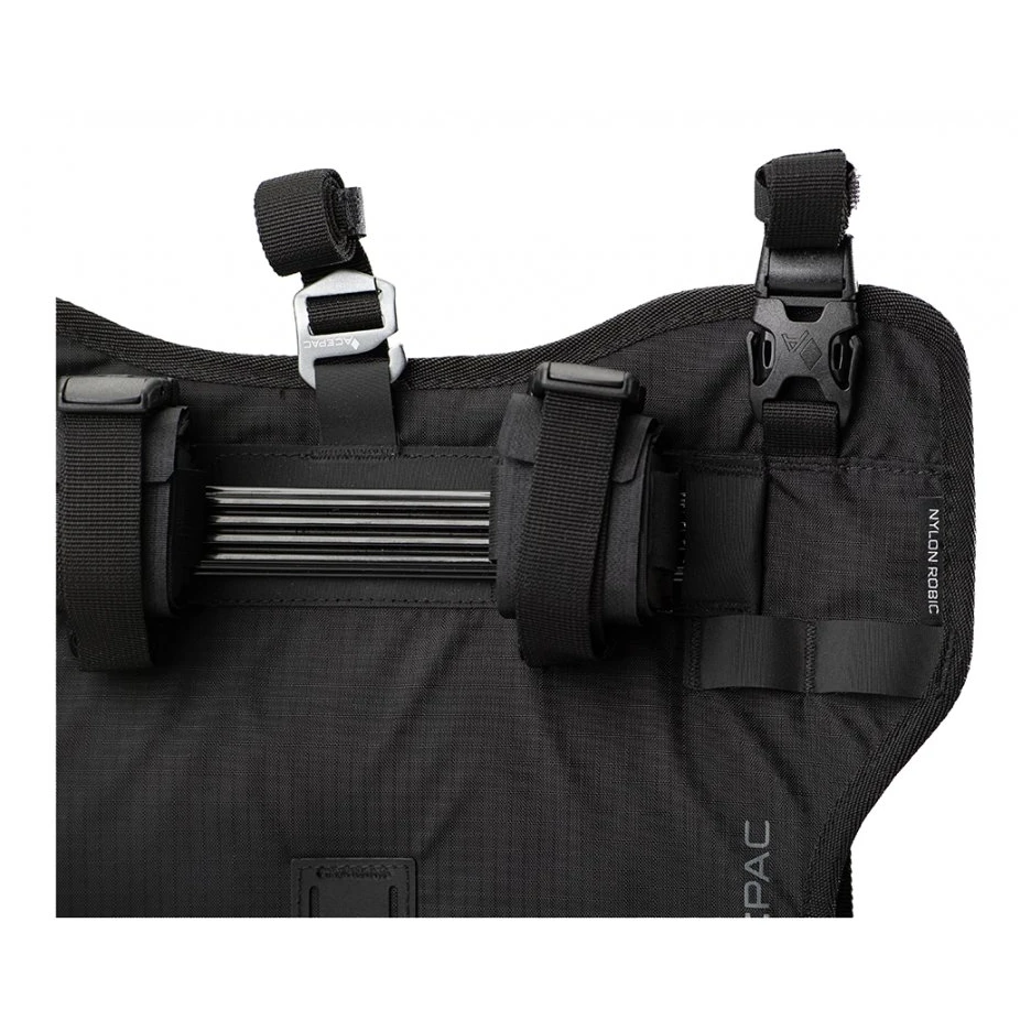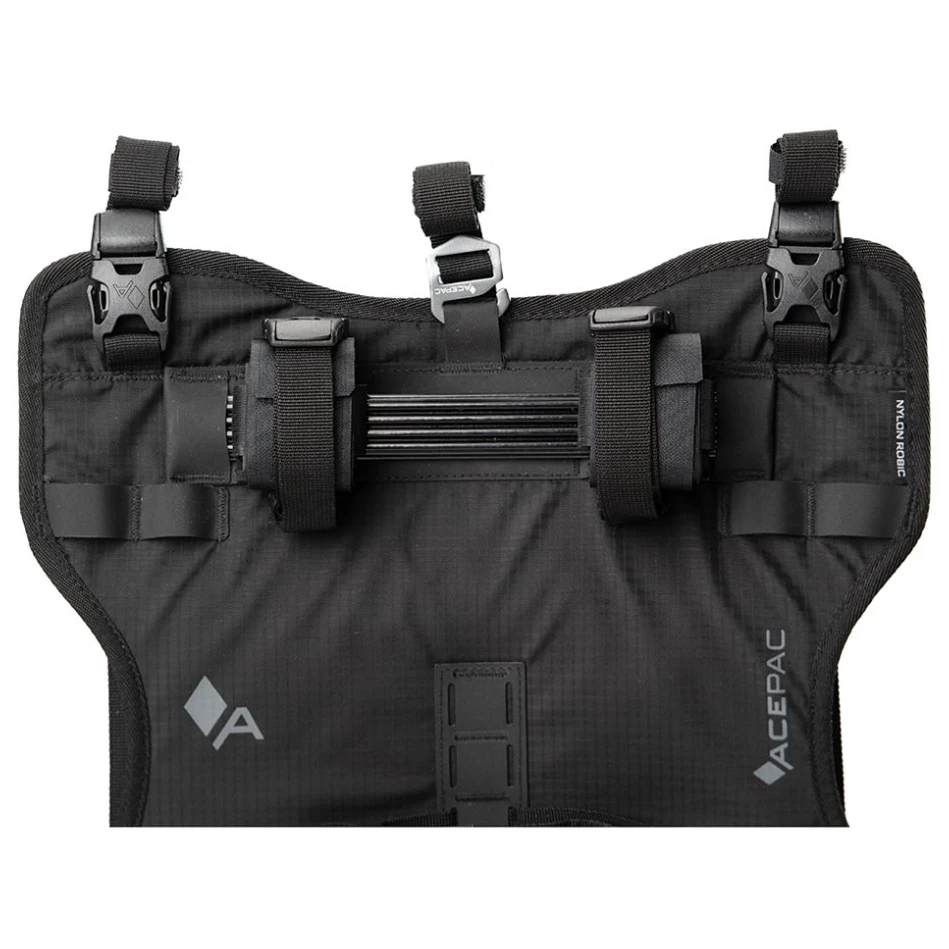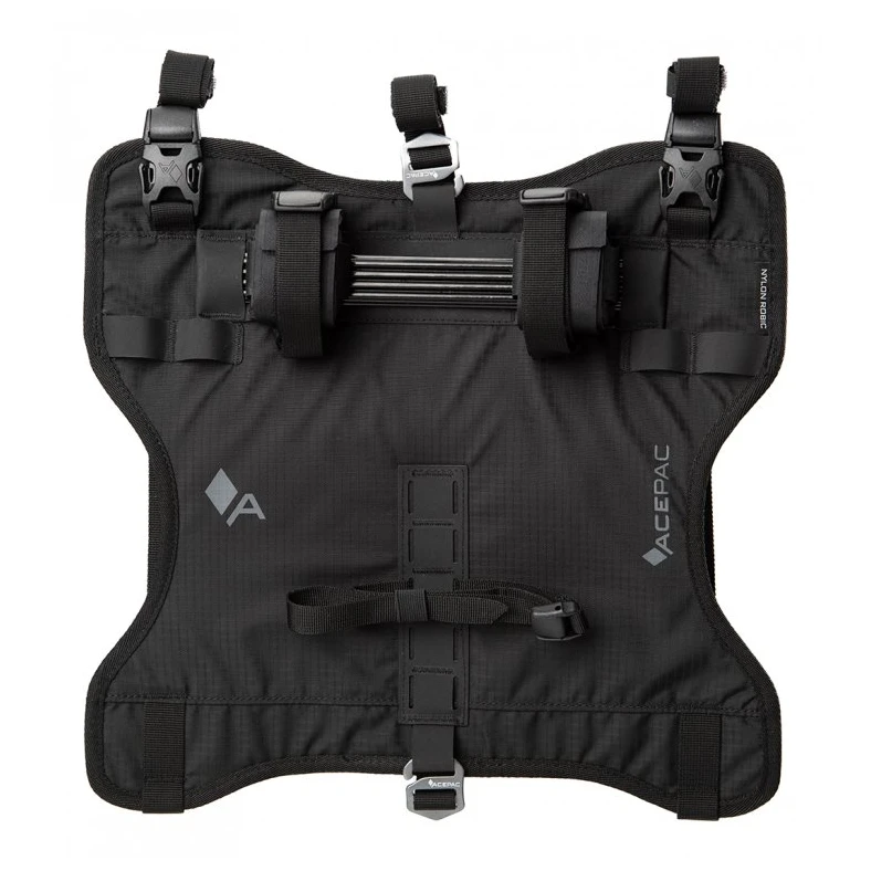 Lenkertasche Acepac Bar Harness MKIII ist für die Verwendung in Kombination mit der Bar Drybag 8/16L-Tasche konzipiert, kann aber mit anderen Taschen oder Hüllen verwendet werden. Mithilfe von Abstandshaltern können Sie es sicher am Lenker befestigen, sodass Sie sich keine Gedanken über Hebel und Kabel machen müssen. Die Tasche verfügt über Klettverschlüssezur einfachen Handhabung und Sicherungsgurte mit Schnallen zur zuverlässigen Befestigung.