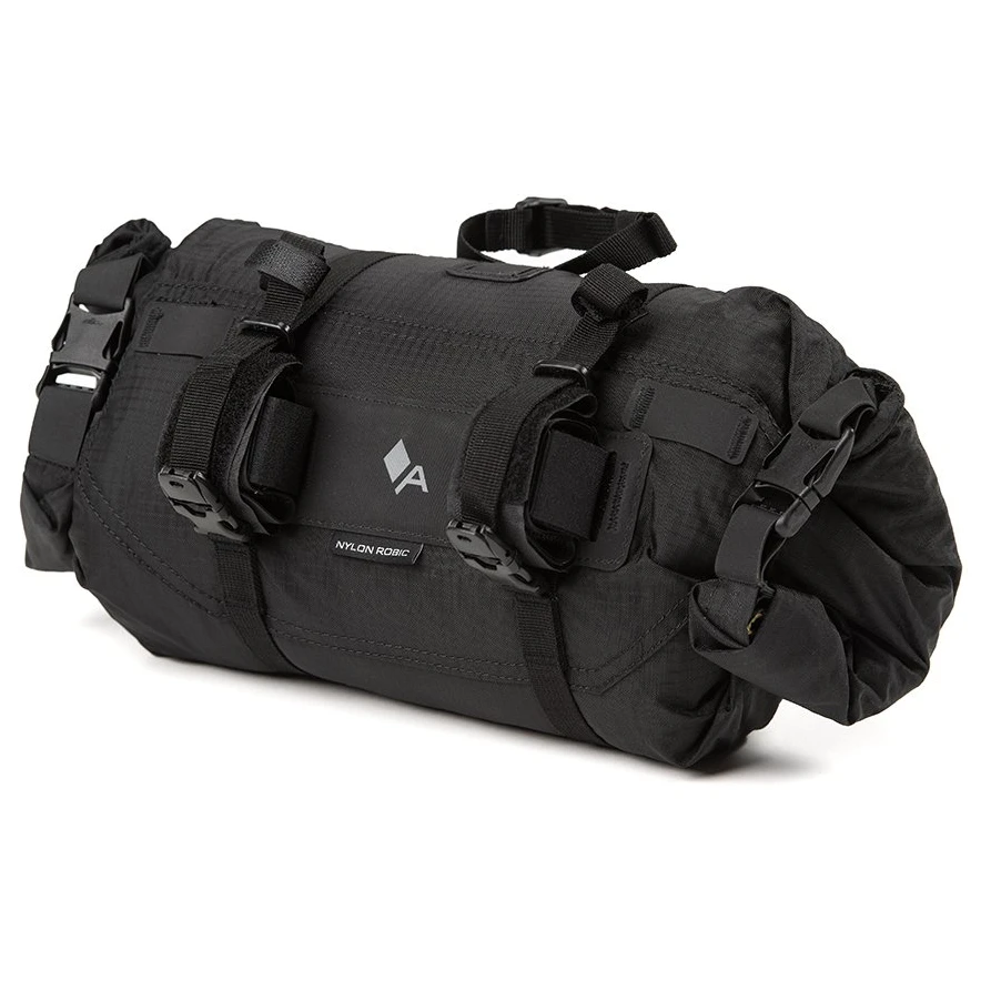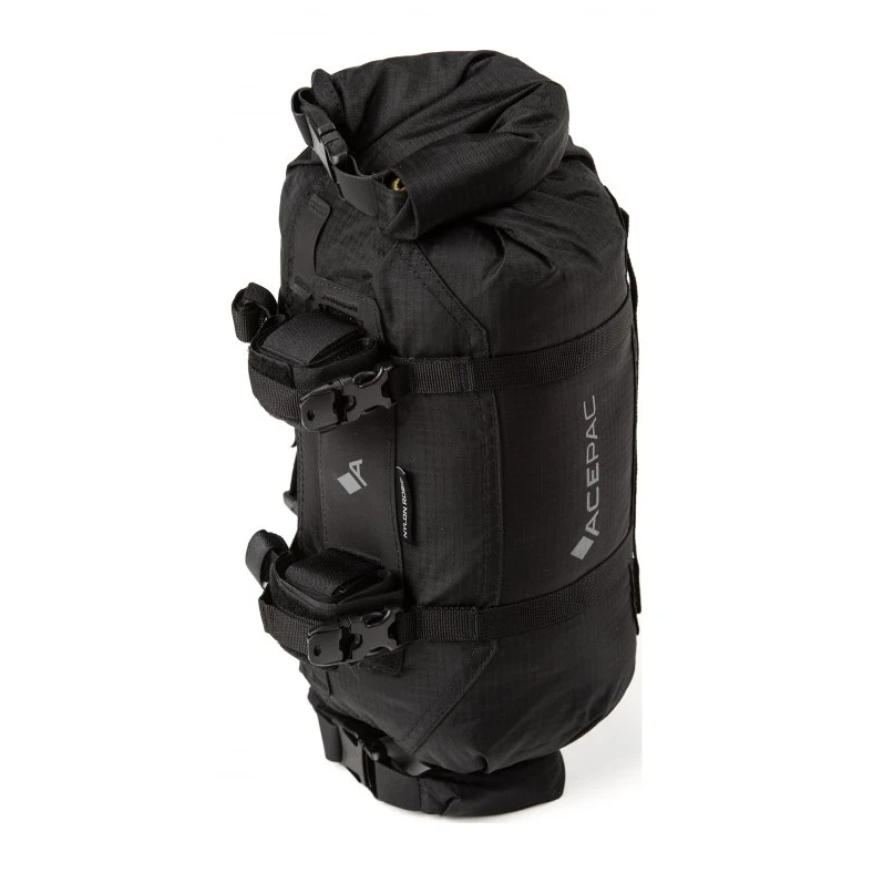 Lenkertasche Acepac Die Minibarrennrolle ist eine kleine zylindrische Tasche mit einem Fassungsvermögen von 5–7 l. Das Hauptmaterial ist Nylon Robic (PU-Beschichtung 1500 mm H2O), ein sehr leichtes und strapazierfähiges Synthetikgewebe. Im Inneren der Tasche finden Sie ein herausnehmbares wasserdichtes Futter (beschichtetes Nylon-RipStop-Gewebe, PU 5000 mm mit verschweißten Nähten), das Ihnen das sichere Gefühl gibt, dass Ihre Sachen auch bei schlechtem Wetter trocken bleiben. Eine zweite Schicht Nylongewebe mit Hypalon verstärkt freiliegende Bereiche, an denen die Tasche die Brems- und Schalthebel berührt.