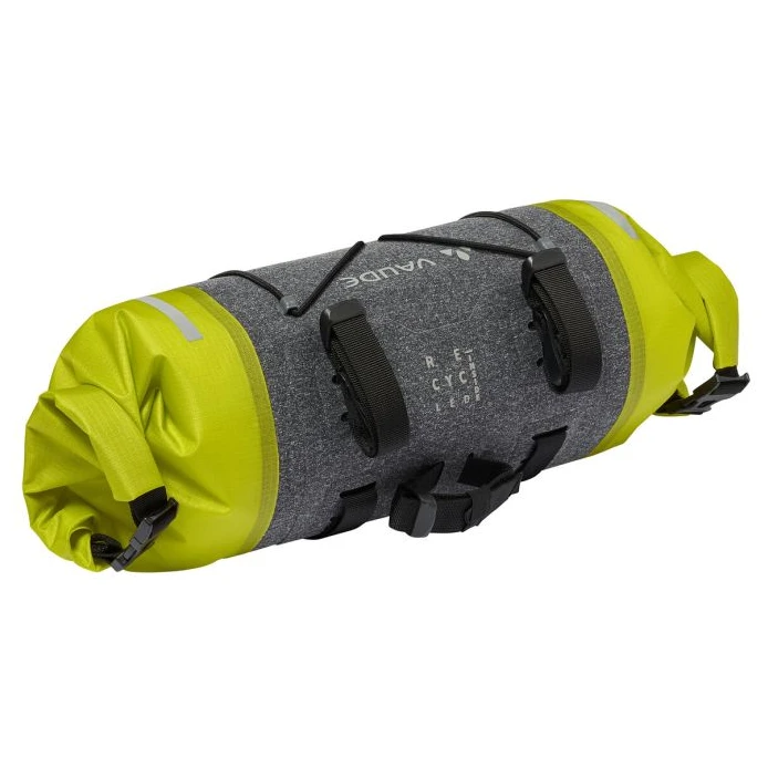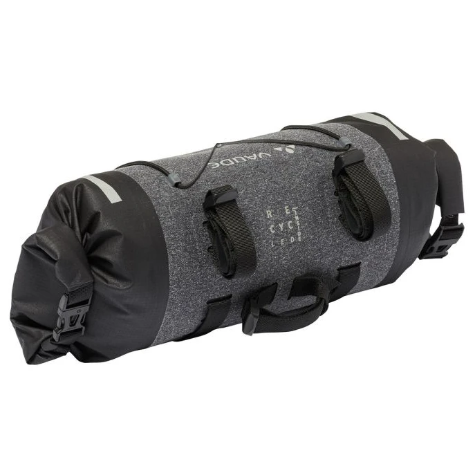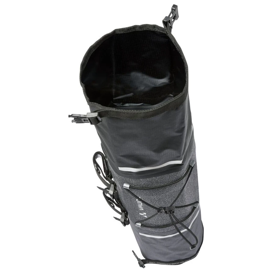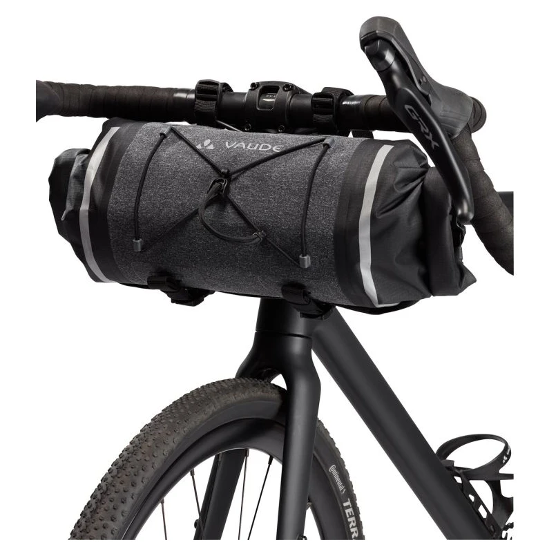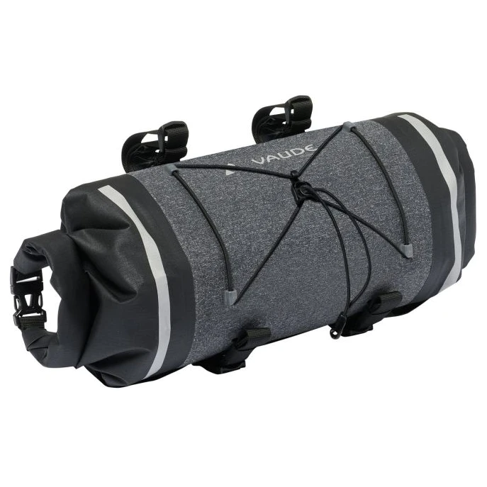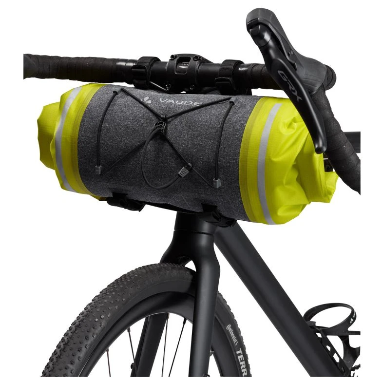 Die wasserdichte Lenkertasche Trailfront Compact von Vaude ist von beiden Seiten zugänglich und lässt sich mittels Rollverschluss beidseitig verschließen.