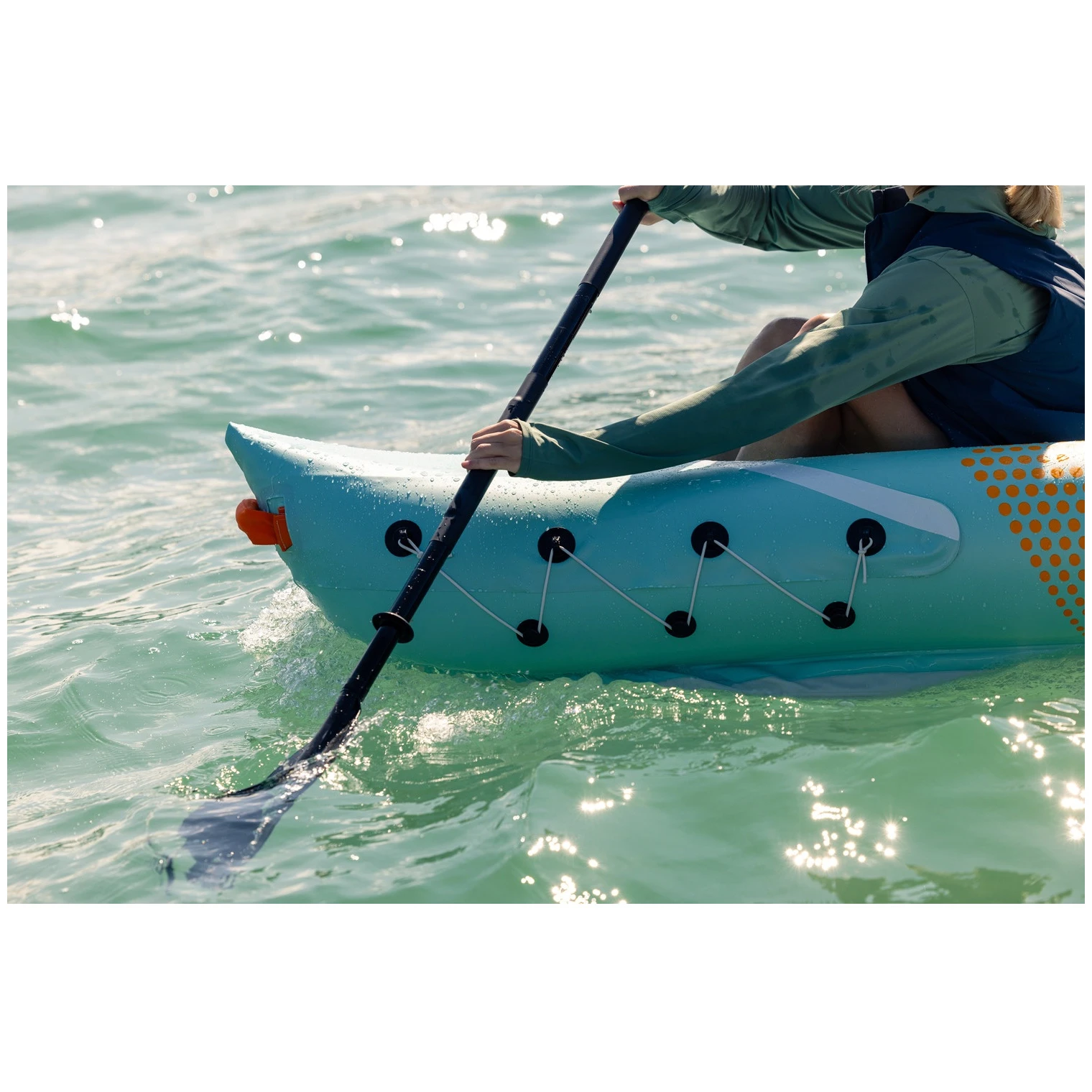 Die breite Form sorgt für hervorragende Stabilität auf dem Wasser und ist daher auch für weniger erfahrene Paddler geeignet. Dank der Ventile Boston, Mini Boston und Mini Double Lock können Sie den Schlauch schnell und einfach aufpumpen und entleeren. Das Kajak ist außerdem mit einem hocheffizienten Entwässerungssystem ausgestattet, das dabei hilft, Wasser aus dem Cockpit abzulassen. Sevytest ermöglicht eine einfache Druckkontrolle während des Aufpumpens und gewährleistet so optimale Leistung und Sicherheit auf dem Wasser.