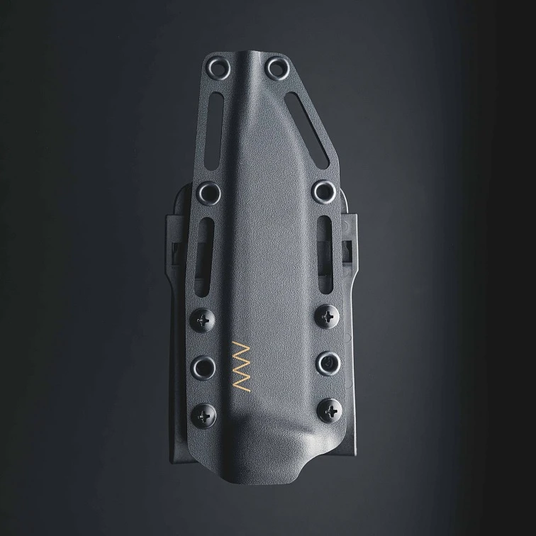 Im Lieferumfang enthalten ist eine handgefertigte Scheide aus Kydex-Material, das aufgrund seines geringen Gewichts und seiner Robustheit in der Flugzeugindustrie verwendet wird. Die Scheide ist selbstarretierend, so dass das Messer nicht von selbst herausfällt. Es kann horizontal oder vertikal montiert werden, in einer Position für Rechts- und Linkshänder gleichermaßen. Zur einfachen Reinigung verfügt das Gehäuse über eine Ablaufrinne.