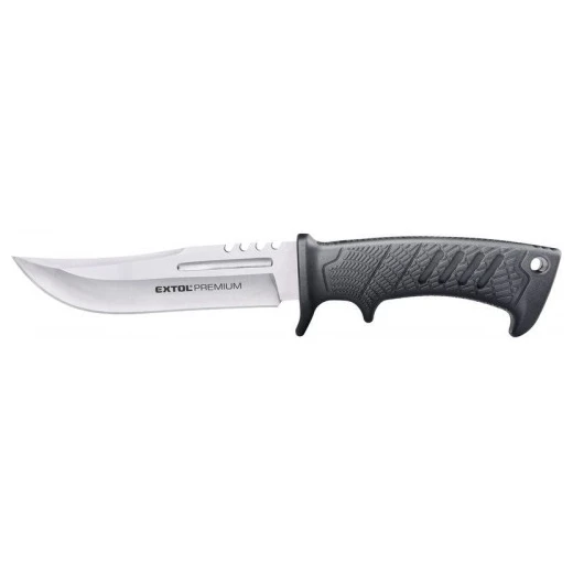Jagdmesser Extol Premium 275/150 mm mit einer Edelstahlklinge von 150 mm Länge sollte in keiner Männerausrüstung fehlen. Das Messer verfügt über einen geformten Griff mit einer Länge von 125 mm, der gut in der Hand liegt. Der Griff verfügt über ein Loch für eine Trageschlaufe, sodass Sie das Messer an Ihrem Rucksack oder an der Hüfte befestigen können. Zum Lieferumfang des Premium-Messers Extol gehört ein Gürtelholster aus Nylon mit Nieten, die ein Durchschneiden der Nähte des Holsters verhindern.