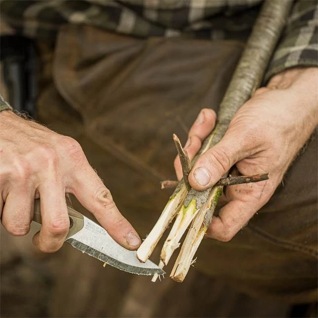 Durch den skandinavischen Schliff, der nach den berühmten skandinavischen Jagdmessern benannt ist, ist das Messer ideal für Bushcraft-Zwecke, da es sich hervorragend für die Holzbearbeitung eignet.