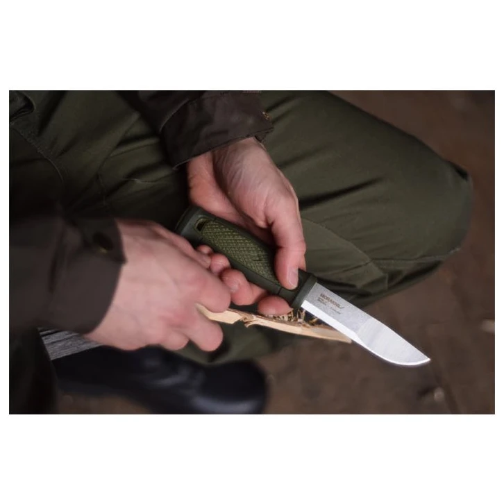 Für jedes Teil des Messers Morakniv Kansbol vom Griff bis zur Klingenspitzewerden nur die besten Materialien verwendet. Das Rautenmuster des Griffs ist ein traditionelles Muster, dessen Variationen auf vielen Mora-Messern zu finden sind und für einen angenehmen und festen Halt sorgt. Die Messerklinge besteht aus hochwertigem, optimal behandeltem schwedischem Edelstahl (Sandvik 12C27). Die Klinge ist im skandinavischen Stil geschärft, wodurch die Klinge lange scharf bleibt. Die Messerklinge hat ein halbmattes Finish, das bei Outdoor-Enthusiasten beliebt ist.