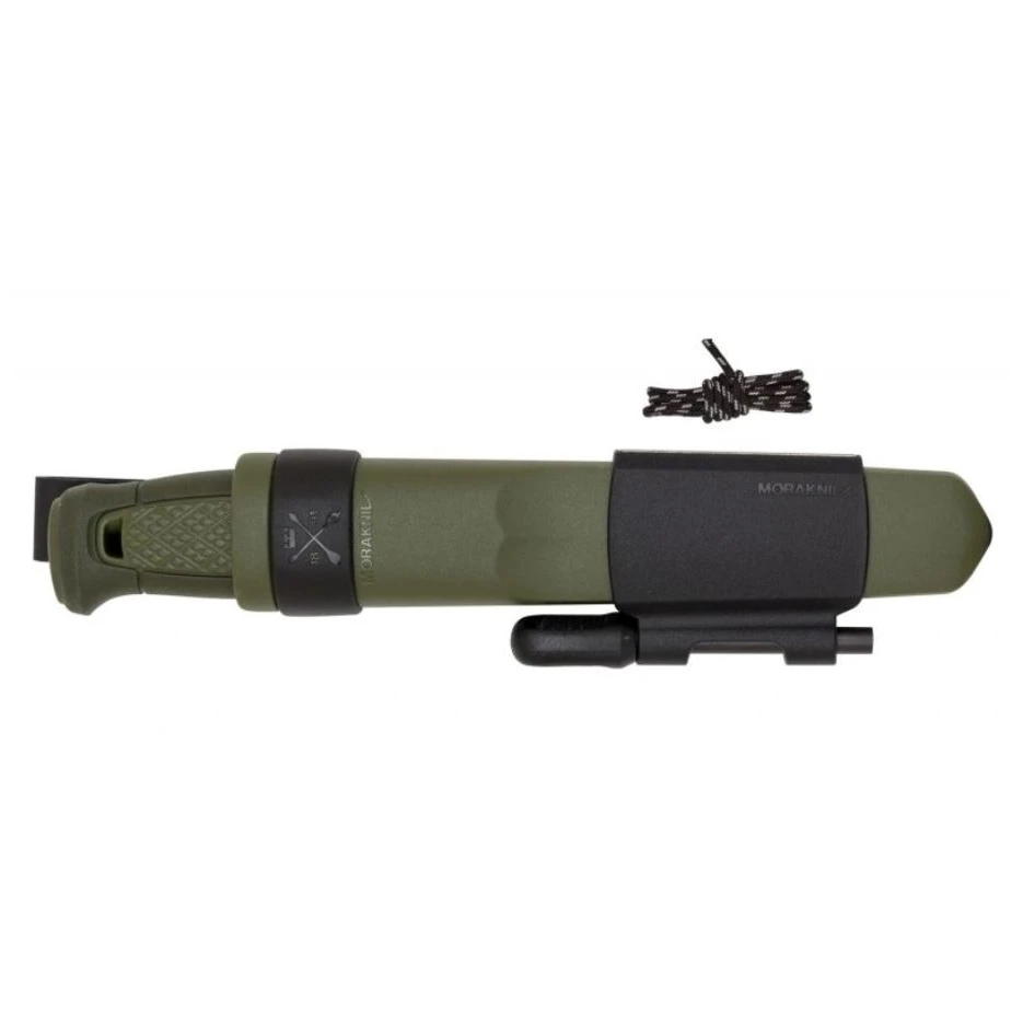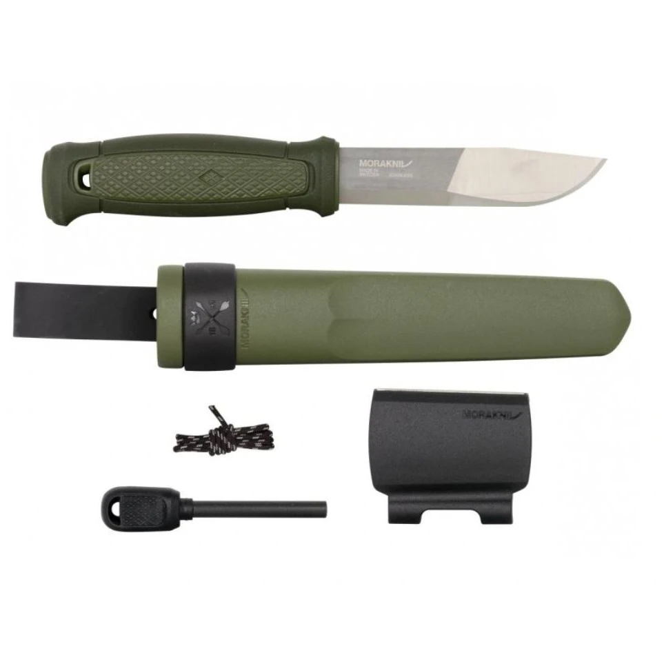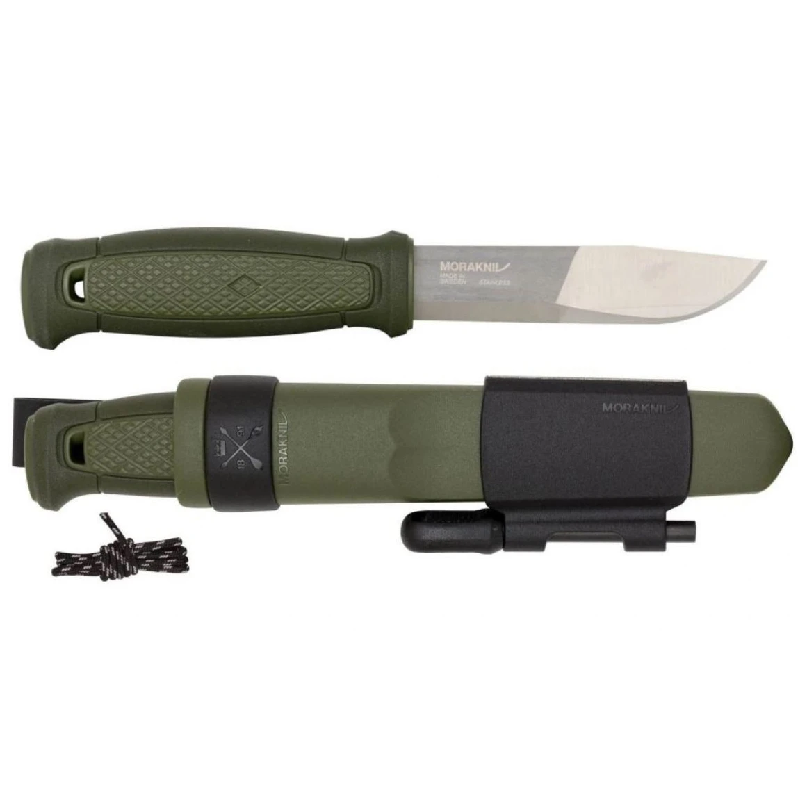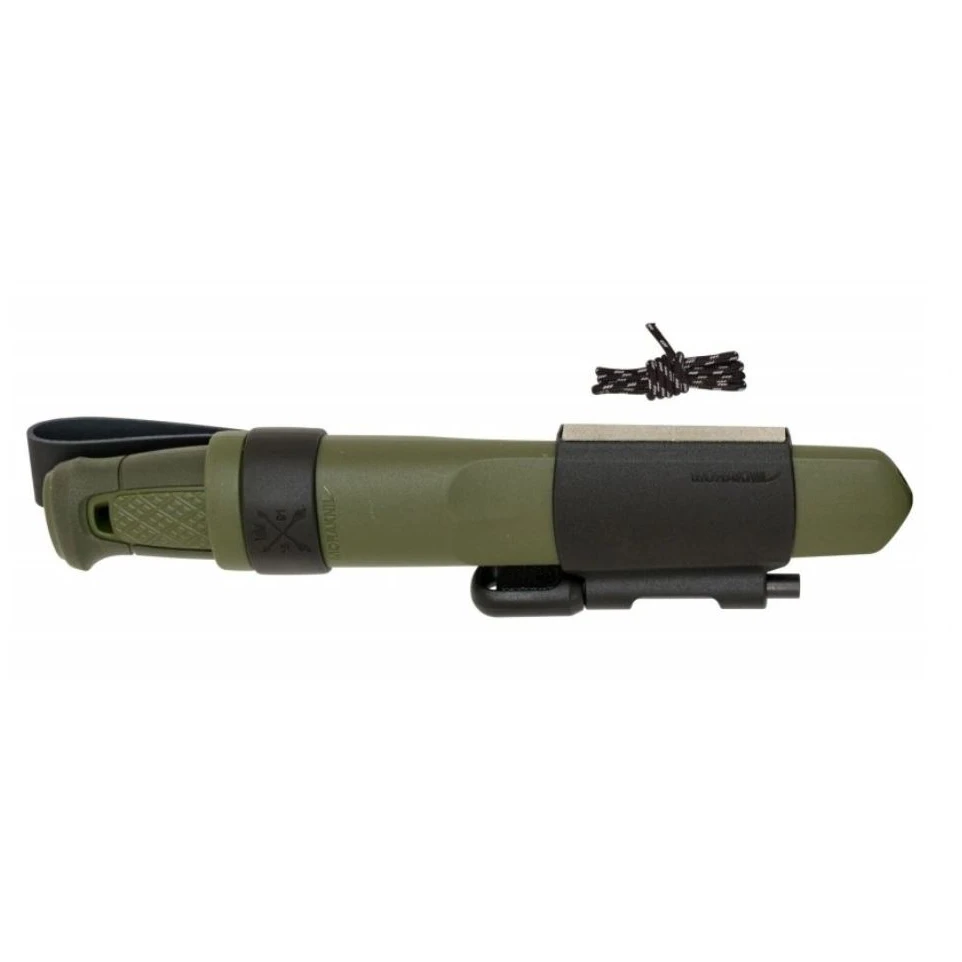 Messer mit fester Klinge Kansbol (S) Survival Kit Green vom Hersteller Morakniv ist ein großartiger Partner für den Aufenthalt und das Überleben in der Wildnis. Die Klinge ist im skandinavischen Stil geschärft, was ihre langanhaltende Schärfe gewährleistet, und hat ein halbmattes Finish, das bei Outdoor-Enthusiasten beliebt ist. Die Klinge aus hochwertigem, optimal behandeltem schwedischem Edelstahlist 2,5 mm breit und 109 mm lang. Zu diesem Messer gehört ein abnehmbares Survival-Kit, das sich auf einem Kunststoffetui befindet. Dieses Set enthält ein 475 mm langes Mehrzweck-Paracord mit reflektierenden Elementen, einen Magnesiumstab und einen Diamantschärfer.