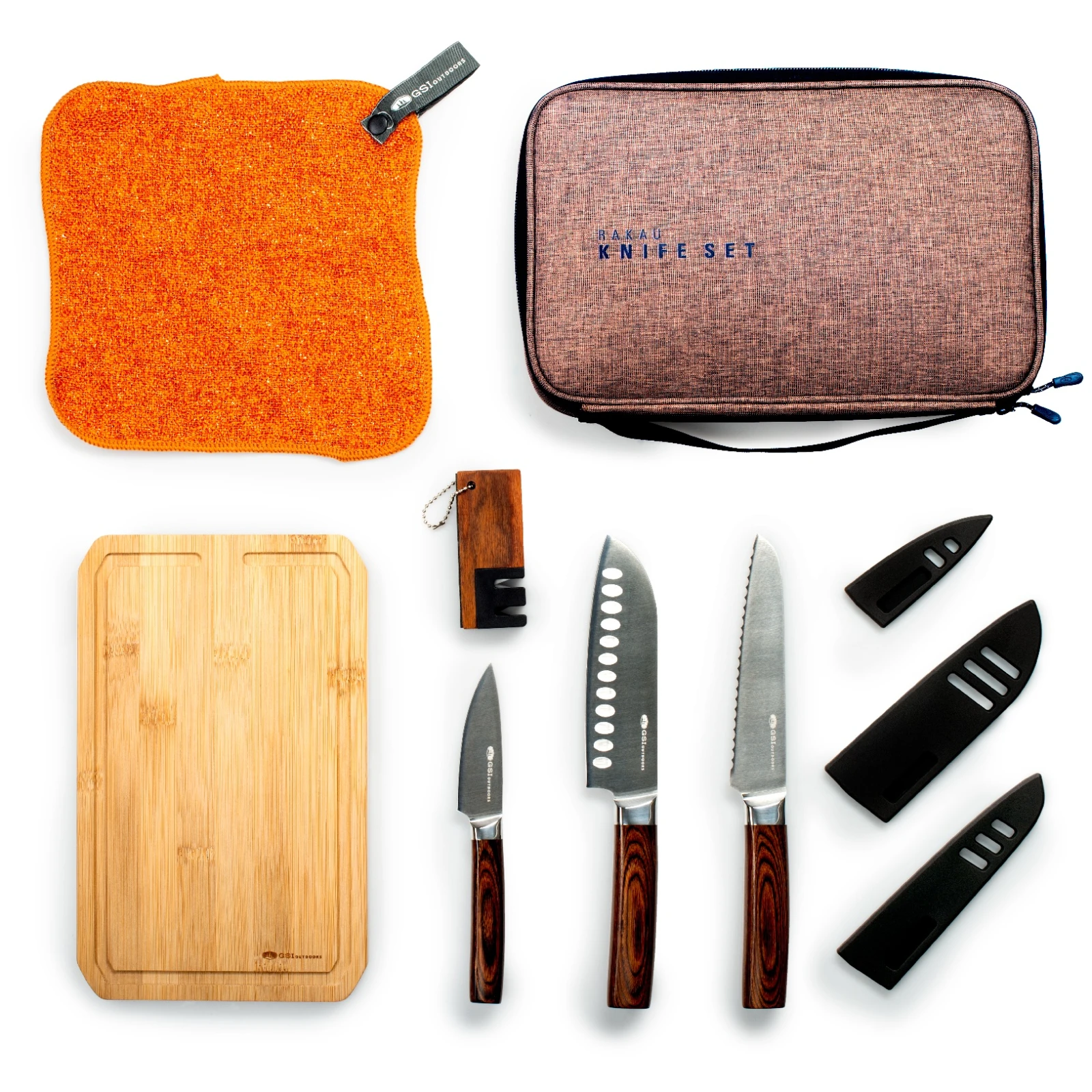 Das GSI Rakau Messerset ist nicht nur für Reisen gedacht. Hochwertige Verarbeitung, Edelstahl und Holzgriff unterstützen Sie bei der Lebensmittelverarbeitung. In dem wiederverschließbaren und in Fächer unterteilten Reiseetui finden Sie außerdem ein Bambus- Schneidebrett mit umlaufender Abflussrinne, ein Tuch und einen Spitzer.
