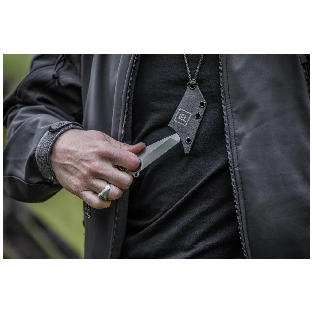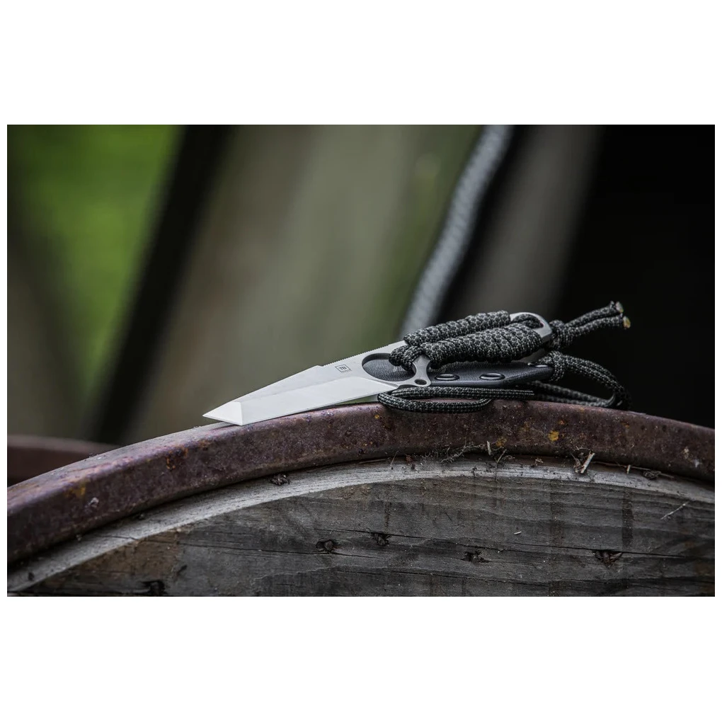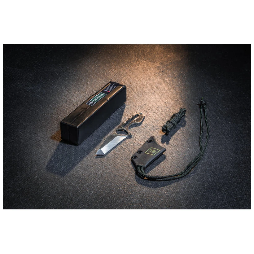 Das S-Neck Tactical Knife der Marke TB OUTDOOR verfügt über eine Kydexscheide in Klingenform und 2 Meter langes Paracord, das ist eine Fallschirmschnur, die sehr stark und gleichzeitig weich ist. Die Kordel lässt sich um den Griff wickeln und das Messer lässt sich bequem um den Hals hängen. Durch die Wärmebehandlung erhält das Messer Härte und damit eine hohe Steifigkeit. Zu dieser Steifigkeit trägt auch die Klinge vom Typ „Tanto“ bei, die ursprünglich bei japanischen Schwertern verwendet wurde.