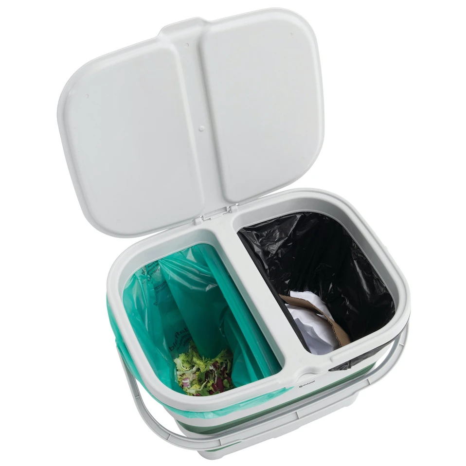 Der Collaps RecycleIt Basket mit zwei Kammern von Outwell ermöglicht Ihnen die Mülltrennung auf Reisen oder beim Camping. Er kann jedoch auch als klassischer Korb zum Transport von Gegenständen oder Wasser verwendet werden. Auf Reisen werden Sie sicherlich die faltbare Konstruktion zu schätzen wissen, dank der er fast keinen Platz einnimmt. Ergänzt wird dieses Design durch einen Ring, der den Behälter in 2 Kammern unterteilt und die Plastiktüten an ihrem Platz hält, sowie einen Plastikdeckel, der das Entweichen von Gerüchen und das Eindringen von Ameisen in den Müll verhindert.