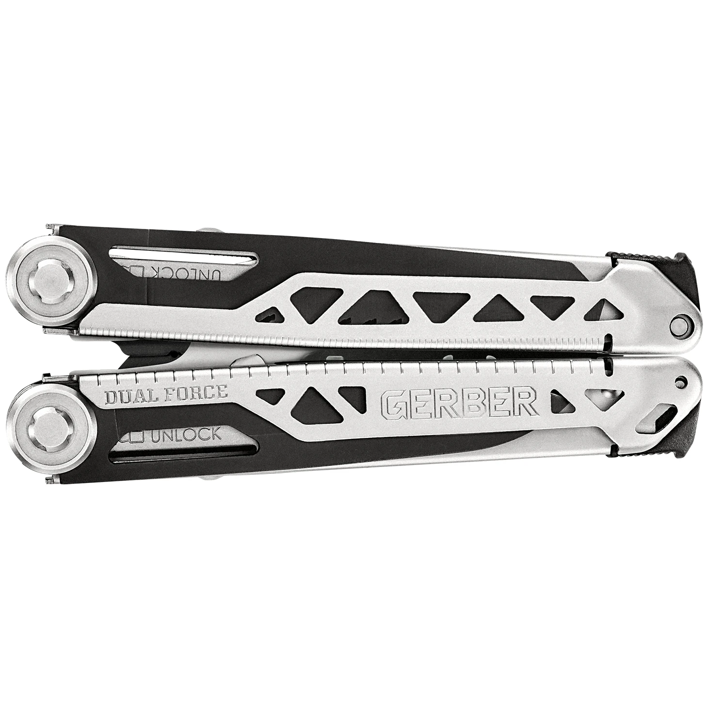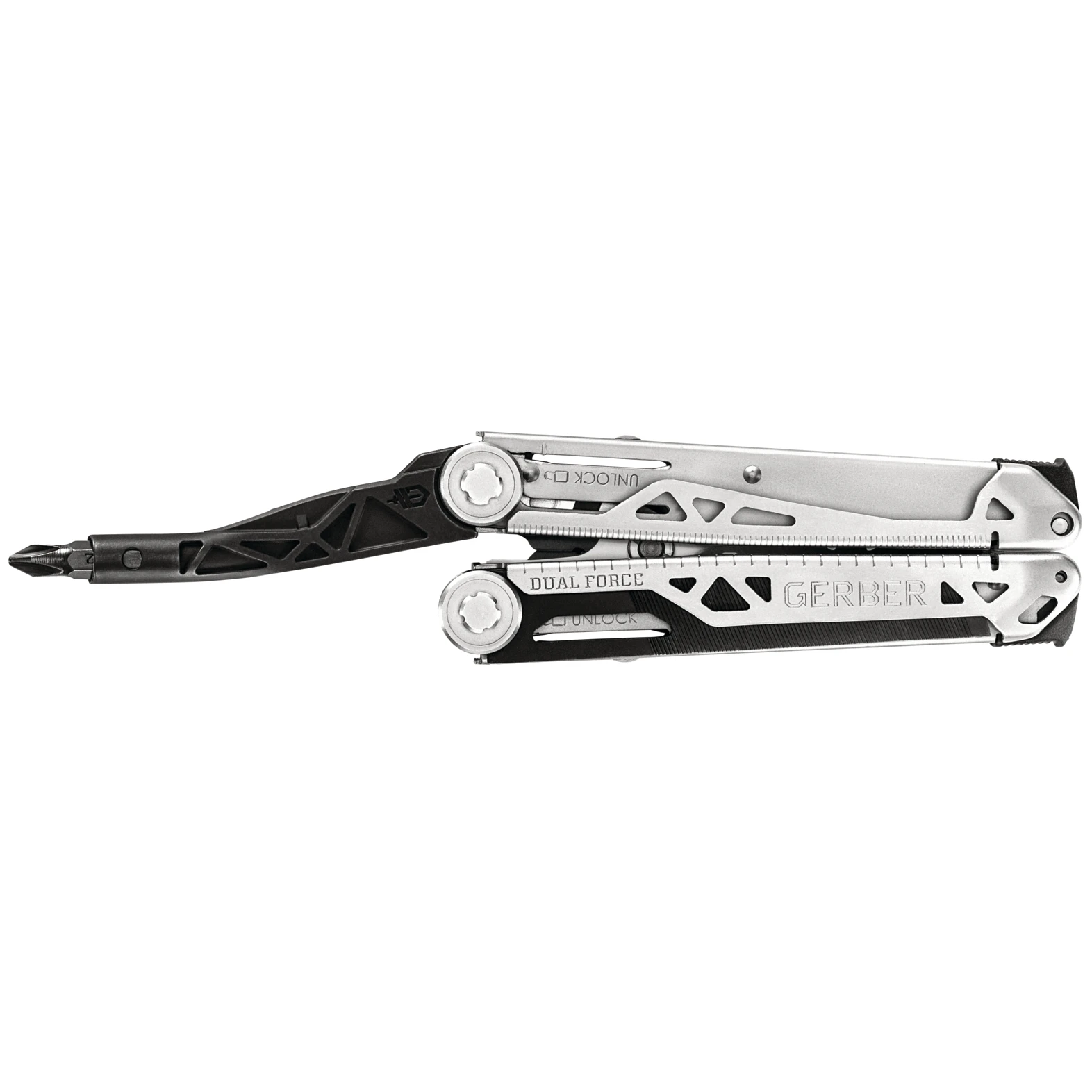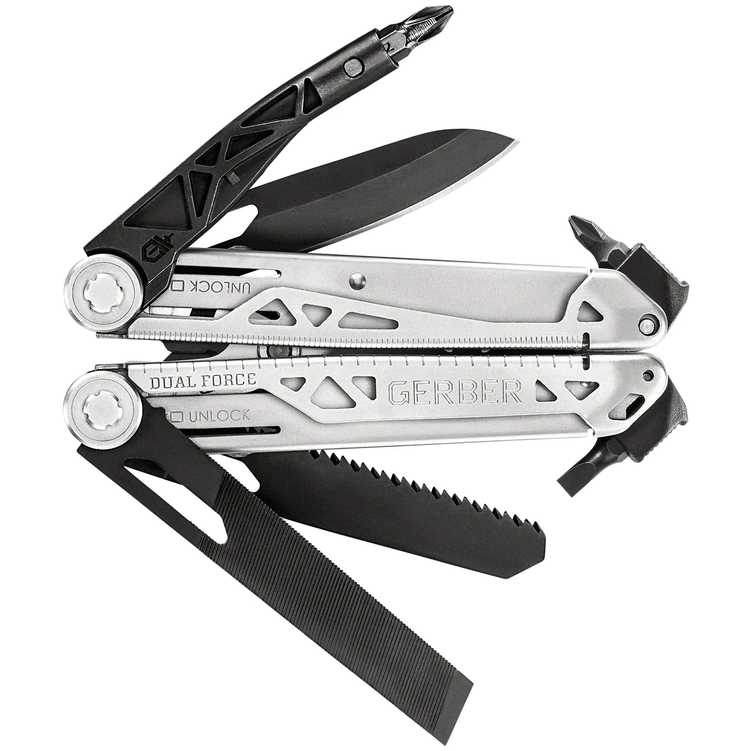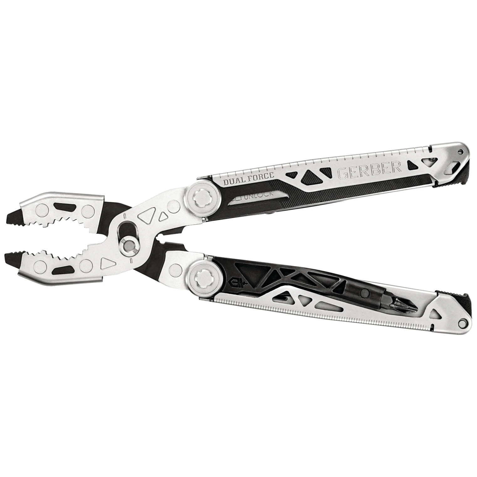 Multifunktionszange der Marke Dual Force MultiTool Gerber ersetzt herkömmliche Werkzeuge. Dieses Multitool bietet eine spezielle Zange und ein Messer mit glatter Klinge. vollwertiger Schraubendreher für Bits und andere Werkzeuge. Ein weiterer Vorteil besteht darin, dass sich die Zange in der Weite verstellen lässt, hierbei stehen Ihnen zwei Stufen zur Auswahl. Im Lieferumfang der Zange ist ein Etuienthalten, das an einem Gürtel oder Rucksack befestigt werden kann. Es kann sowohl in horizontaler als auch in vertikaler Position montiert werden. Die Zange kann auch an einer Schnur aufgehängt werden.