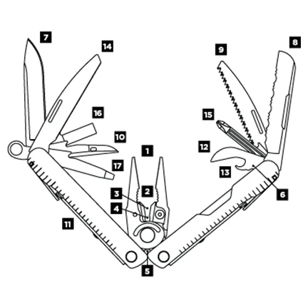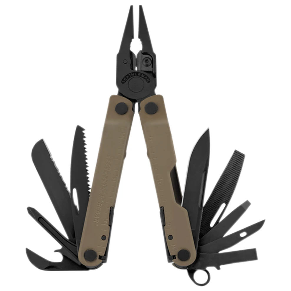 Das Design des REBAR Multitools greift die Tradition der Marke Leatherman auf. Basis ist eine schlanke, aber dennoch sehr robuste Multifunktionszange mit auswechselbaren Schneidklingen. Die universelle Ausstattung beinhaltet alle wichtigen Grundwerkzeuge und stellt jeden zufrieden: vom Heimwerker über den professionellen Installateur bis hin zum Wanderer und Touristen. Jedes der siebzehn Funktionswerkzeuge ist mit einer Sicherung gegen unbeabsichtigtes Zusammenklappen ausgestattet.