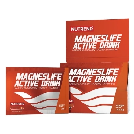 Spezielle Instant-Mischung aus Vitaminen Nutrend Magneslife Active Getränk mit 10 x 15 g wichtigen Vitaminen und Mineralstoffen, wie Magnesium und Kalium, zur Zubereitung eines Getränks zur Flüssigkeits- und Nährstoffergänzung nach sportlichen Aktivitäten. Eine wirksame Formel stellt einen strategischen Ansatz dar, um den negativen Auswirkungen von Erschöpfung und Dehydrierung entgegenzuwirken.