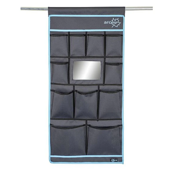 Der multifunktionale Organizer Tent Organizer 11 Mirror von Bo-Camp ist eine nützliche Ergänzung für Ihr Zelt oder Ihren Wohnwagen. Der Organizer verfügt über 4 Taschenreihen, die Ihr Zelt in einem absolut ordentlichen Zustand halten. Zusätzlich ist es mit einem praktischen Spiegel ausgestattet. Die Gesamtzahl der Taschen beträgt 11 und sie sind unterschiedlich groß. Einige sind kleiner für kleinere Gegenstände und andere dienen zur Aufbewahrung größerer Gegenstände. Der Organizer lässt sich auf verschiedene Arten aufhängen, zum Beispiel mittels Klettverschluss oder Aufhängeöse. Hergestellt aus hochwertigem zweifarbigem 600D-Polyester.