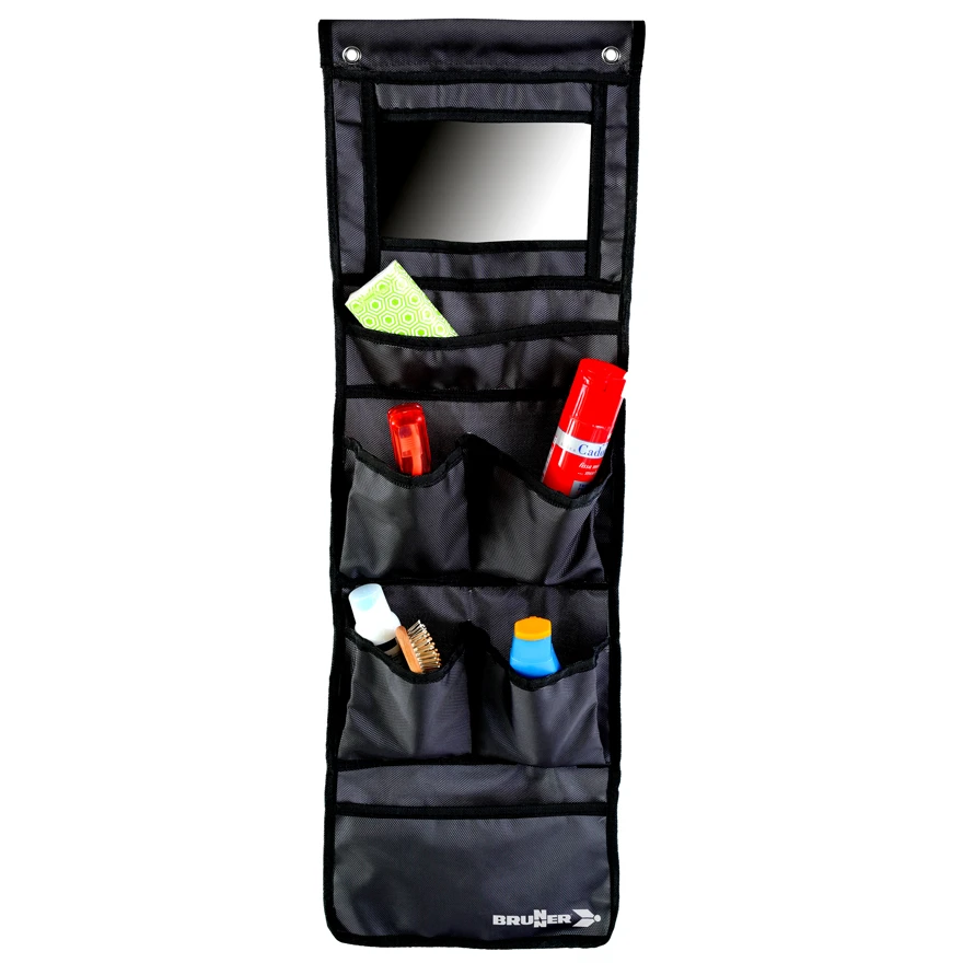 Der Reise- Organizer Hangar 6 der Marke Brunner bietet eine einfache und schnelle Lösung, um auf Reisen Ordnung in Ihr Hab und Gut zu bringen. Diese kannst Du in insgesamt 6 Taschen verstauen. Neben Taschen ist der Organizer auch mit einem Spiegelausgestattet. Der Organizer selbst besteht aus 100 % Polyester und kann an einem Ort Ihrer Wahl aufgehängt werden. Die kompakten Abmessungen gewährleisten bequemes Tragen und Aufbewahren.