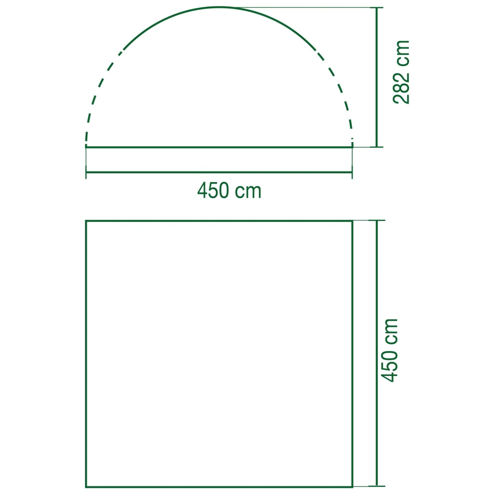 Die langlebige Stahlkonstruktion mit einem Dach aus 159D Polyester bietet einen Raum mit einer Fläche von 450 x 450 cm und einer Höhe von 282 cm. Auch diese lässt sich dank der verstellbaren Beine regulieren. Das Zelt wird in einer Transporttasche geliefert. Um die Privatsphäre zu erhöhen oder vor widrigen Witterungsbedingungen zu schützen, können Sie anbringbare Wände und Türen erwerben.