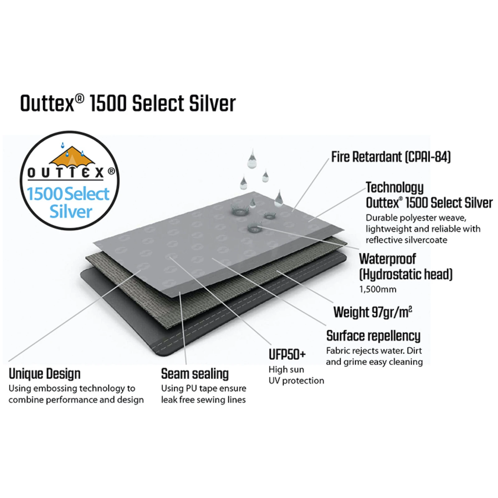 • Außenzelt: Outtex® 1500 Select Silver, 100 % Polyester, feuerhemmend, PU-verschweißte Nähte, LSF 50+