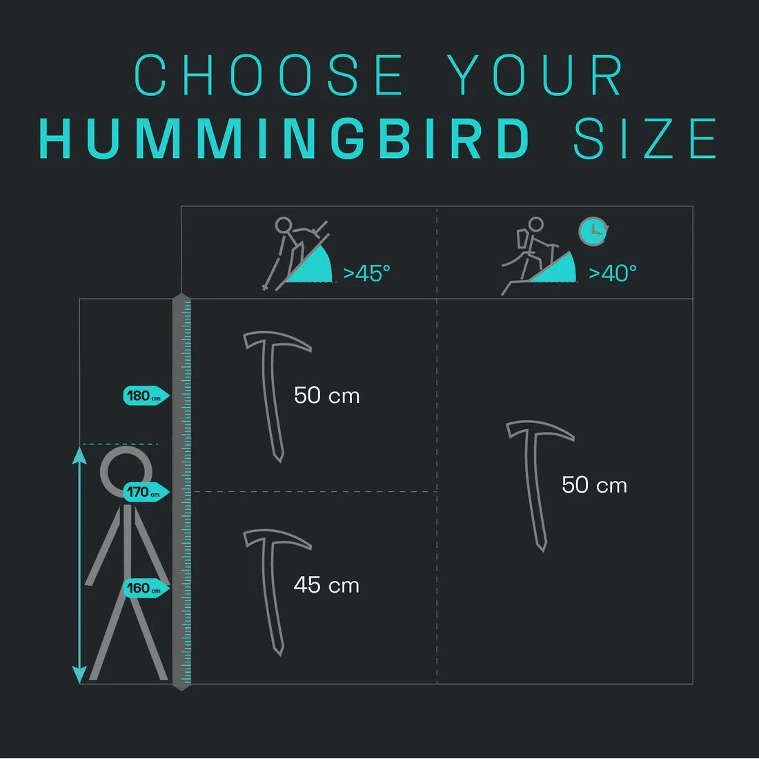 Blue Ice Der Hummingbird Ice Axe ist ein ultraleichter Eispickel, der die Stärke von Titan und Aluminium kombiniert. Ideal zum Bergsteigen und für technische Aufstiege in anspruchsvollem Gelände.