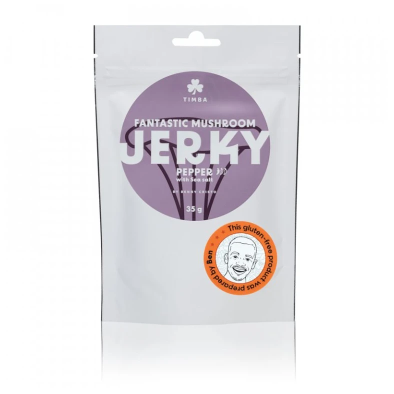 Mushroom Jerky - Pfeffer mit Meersalz ist Mushroom Jerky der Firma Timba, was die Qualität des Produktes beweist. Sie genießen den unverfälschten Geschmack von Jerky mit einer leicht würzigen Note.
