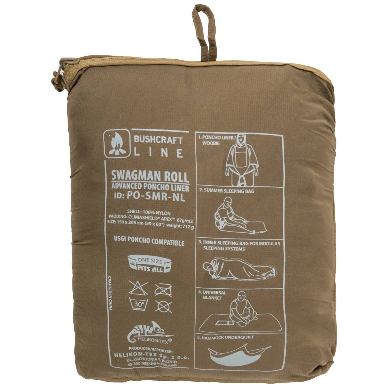 Swagman Coyote von Helikon-Tex ist ein moderner Multifunktionsponcho aus Zwei-Wege-Stretch-Nylon mit Dupont Teflon-Schutzgewebe und einem extra warmen Futter aus Climashield Apex-Isoliermaterial. Sie können den multifunktionalen, ultraleichten Poncho als Kapuzenmantel, Universaldecke oder Bodenunterlage, Notfall- oder Sommerschlafsack, Thermofutter für einen Schlafsack, eine Hängematte oder als Thermofutter für einen Standard-Helikon-Poncho verwenden.