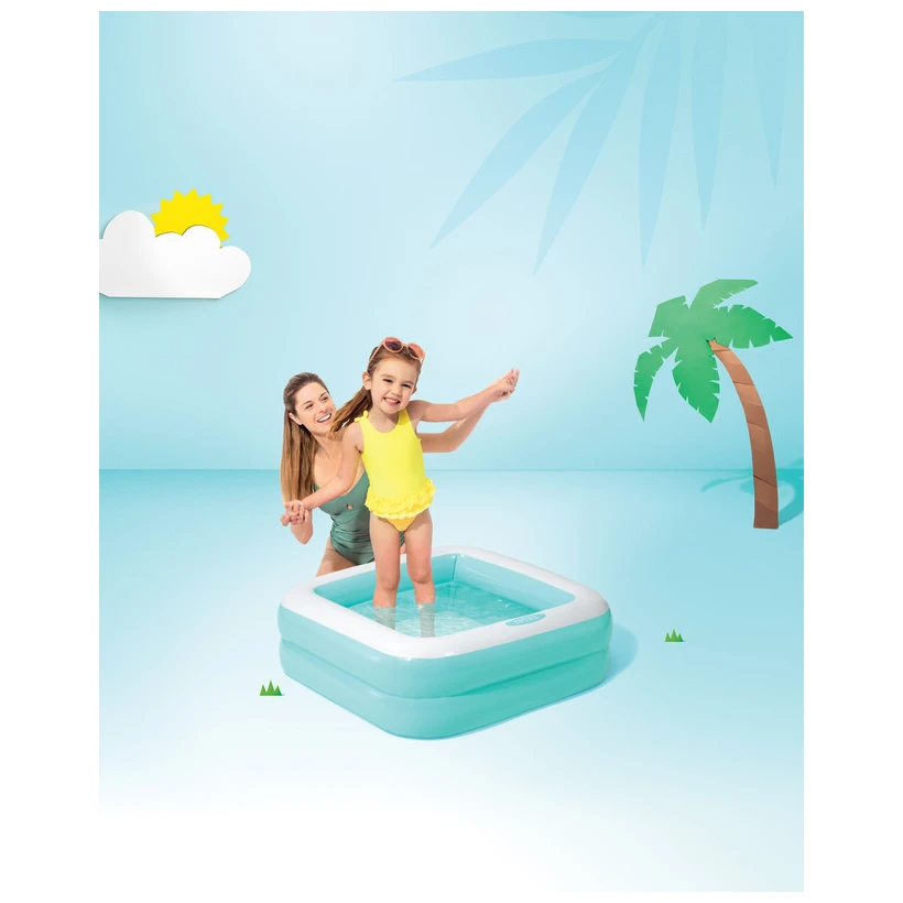 Der Play Box Pool ist ein quadratisches Kinderbecken mit aufblasbarem Boden vom renommierten Hersteller Intex. Das Wasservolumen von 57 l bei einem Wasserstand von 17 cm bietet dem Kind viel Platz und Wasser zum Spielen, lässt sich aber gleichzeitig täglich problemlos mit sauberem Wasser auffüllen. Die Produkte der Firma Intex erfüllen alle Sicherheitsvorschriften und sind aus hochwertigen und langlebigen Materialien gefertigt.
