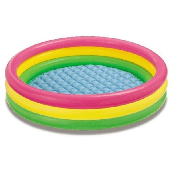 Intex Sunset Glow Pool ist ein aufblasbares Kinderbecken, das aus drei farbigen Kreisenbesteht. Es hat eine runde Form und einen weichen, aufblasbaren Boden. Dank des langlebigen Vinyls ist der Pool sehr widerstandsfähig gegen Beschädigungen. Für kleinere Schäden liegt ein Reparaturset bei. Das Becken hat die Maße 147 × 33 cm und ist für Kinder ab zwei Jahren geeignet. Das Wasservolumen beträgt bei einer Füllhöhe von 24 cm 275 Liter.