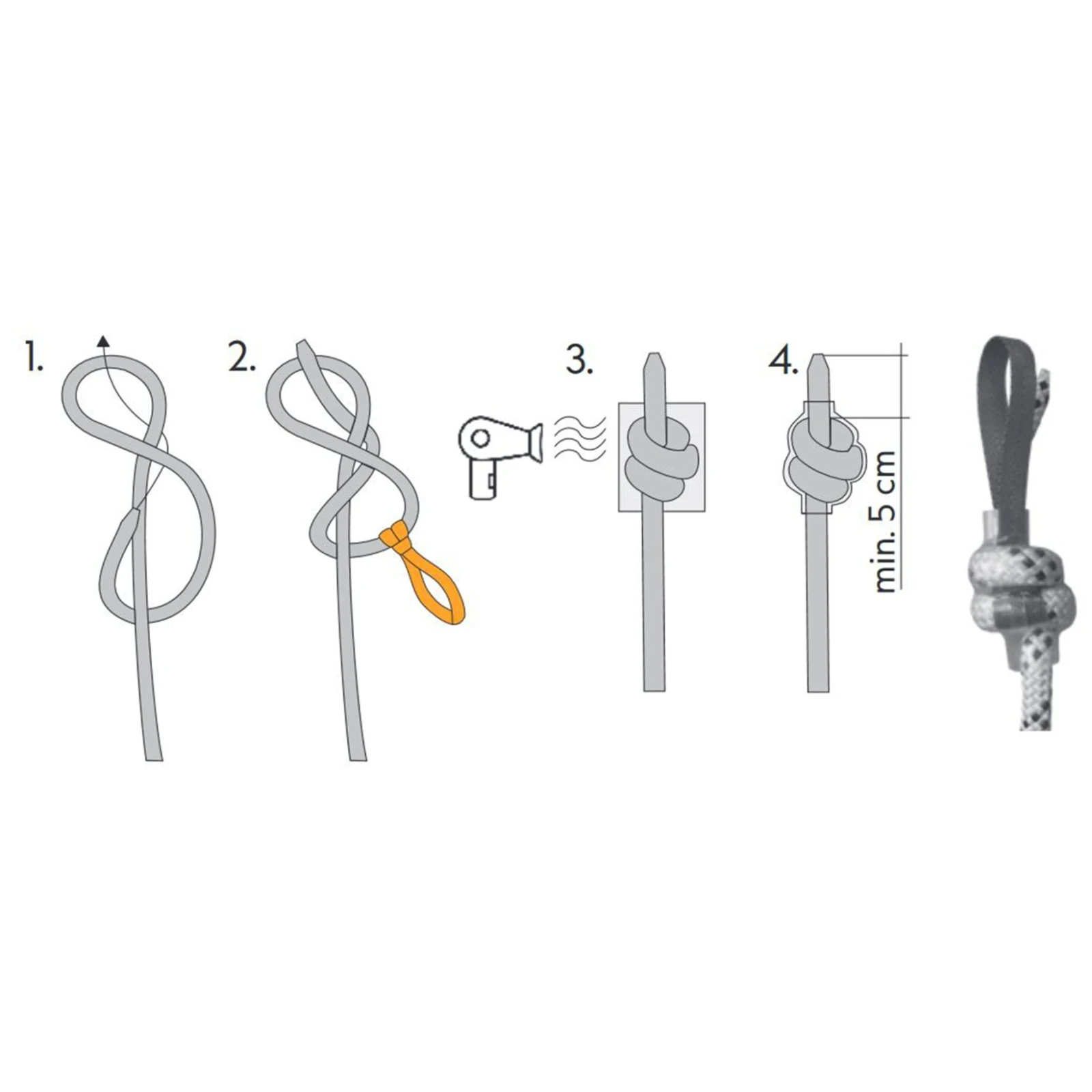 - An einem Ende endet das Seil mit einer eingenähten Öse, am anderen Ende muss ein Sicherungsknoten gemacht werden (siehe Gebrauchsanweisung)