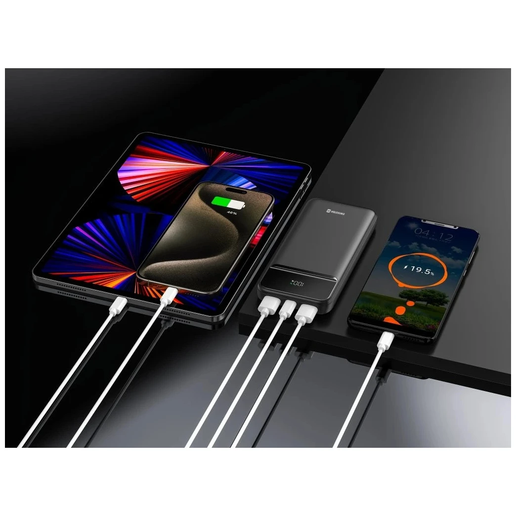 Die Powerbank Swissten mit einer Kapazität von 10.000 mAh versorgt Ihre Geräte mehrere Tage lang mit Strom. Ideal für Ihre Radtouren, Camping- oder Naturausflüge. Sein kompaktes Design und die LED-Anzeige zur einfachen Überprüfung des Batteriestatus machen ihn zu einem praktischen Begleiter für den täglichen Gebrauch. Darüber hinaus bietet es umfangreiche Lademöglichkeiten dank mehrerer Ausgänge und Schnellladung.